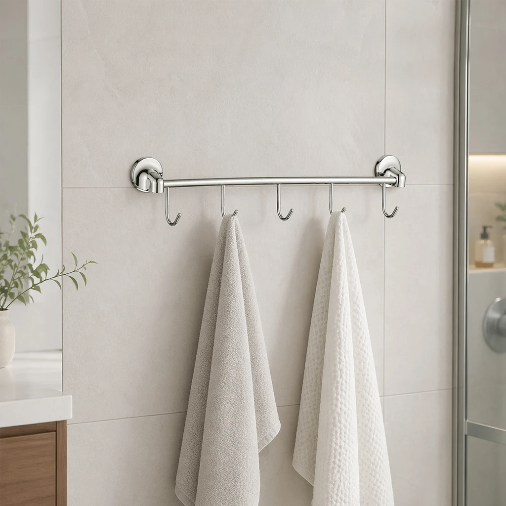 Крючки на штанге Ekko E1716-5 подойдут для хранения банных полотенец, полотенец для рук, домашней одежды, халатов или душевых принадлежностей, которые должны быть всегда под рукой. Их удобно установить рядом с раковиной, ванной, душевой зоной или у входа в санузел. Такой настенный держатель с крючками помогает поддерживать порядок, делает помещение более организованным и добавляет комфорта в повседневных мелочах. Купить крючки Ekko 1716-5 стоит тем, кто ищет металлические крючки для ванной с пятью точками размещения, надежным креплением и универсальным хромированным покрытием. Это практичный аксессуар для ванной комнаты, который сочетает аккуратный внешний вид, удобство размещения вещей и понятную долговечную конструкцию для ежедневного использования.