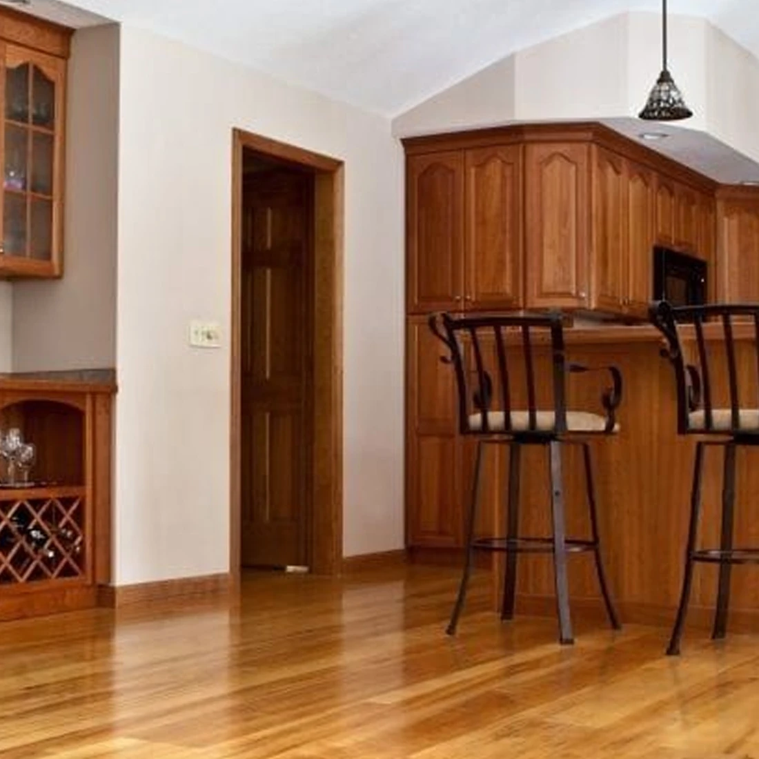 Плинтус изготовлен из ПВХ, поэтому влагостойкий и не боится бытовой химии. Его можно спокойно протирать при уборке, не опасаясь разбухания и появления пятен. Такой вариант подходит для кухни, прихожей и других зон, где полы и плинтуса чаще контактируют с влагой и моющими средствами. ПВХ также устойчив к износу в повседневной эксплуатации, что важно для проходных помещений.