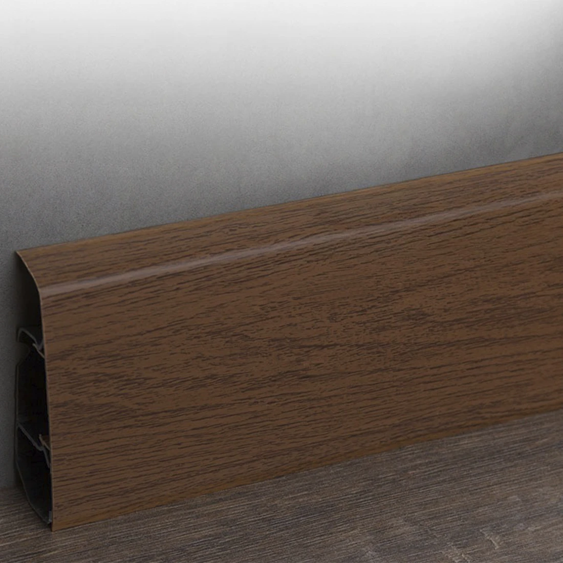 Размеры плинтуса: длина 2200 мм, высота 70 мм, ширина 26 мм. Высокий профиль особенно удобен в коридоре и гостиной, где хочется выразительной линии по периметру, а также в помещениях с неровными стенами. Мягкий край помогает плинтусу плотнее прилегать к полу, закрывать мелкие щели и уменьшать попадание пыли под плинтус. Благодаря этому отделка выглядит аккуратнее даже без идеального выравнивания стен.