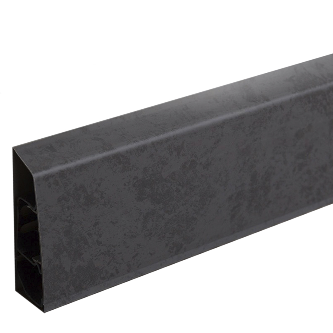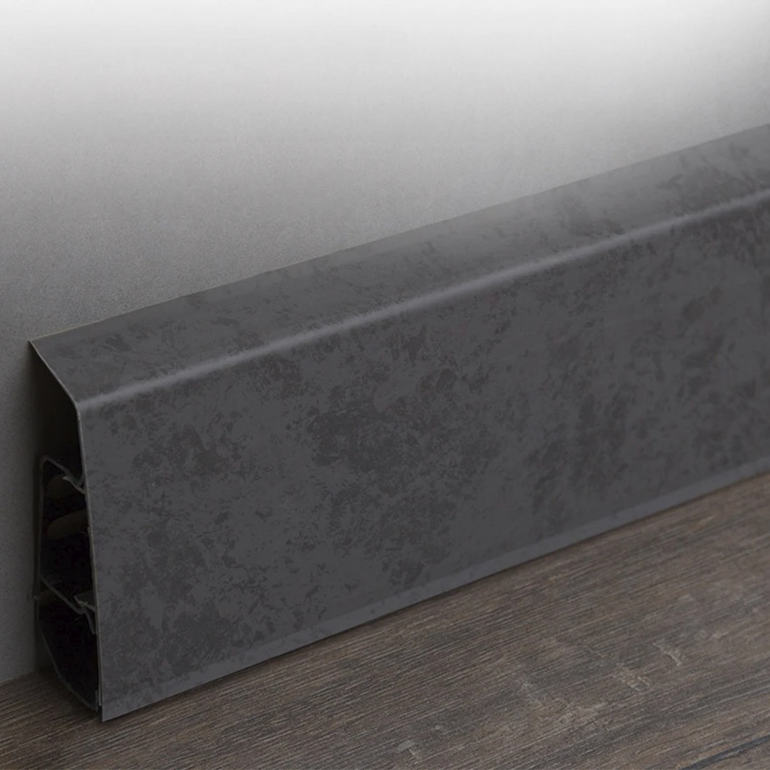 Цвет плинтуса — чёрный, с текстурой под бетон, наименование цвета у производителя 7027. Он хорошо подходит для современных интерьеров в стиле лофт, минимализм и индустриальный дизайн, подчёркивая геометрию помещения и напольного покрытия.