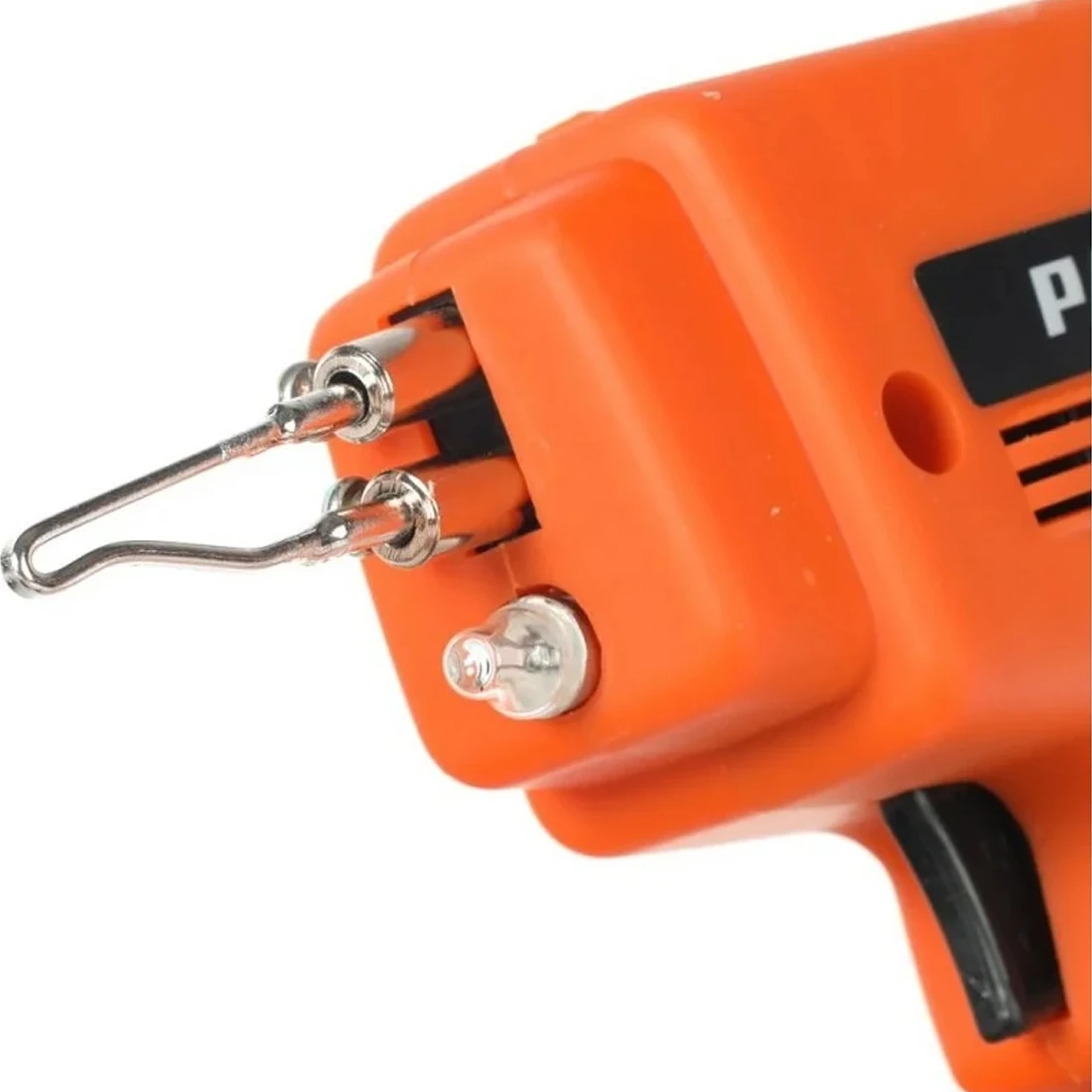 Корпус паяльного пистолета выполнен из прочного пластика, а прорезиненный морозостойкий кабель добавляет удобства при эксплуатации в разных условиях, в том числе если работа проводится в прохладных помещениях или на улице. Пистолет имеет компактные размеры и сравнительно небольшой вес 0,8 кг, поэтому его легко держать в руке достаточно долго, а работа не вызывает быстрой усталости. Эргономичная рукоятка позволяет уверенно держать инструмент даже при точных манипуляциях, что особенно важно при мелких работах.