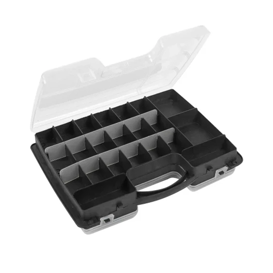 Корпус выполнен из пластика (в том числе применяется ABS), а габариты органайзера 295×220×76 мм позволяют разместить его на полке, в ящике верстака или в машине без лишнего объёма. Внутри предусмотрено 32 отделения: на одной стороне 22 секции для крепежа, на другой — 10 более крупных ячеек. Переставные перегородки помогают подстроить пространство под вашу задачу: можно сделать больше мелких отсеков для метизов или, наоборот, укрупнить ячейки под битодержатели, головки, небольшие свёрла и другие аксессуары. Прозрачные крышки упрощают работу: видно, где что лежит, и не нужно открывать органайзер для мелочей каждый раз, чтобы проверить содержимое.