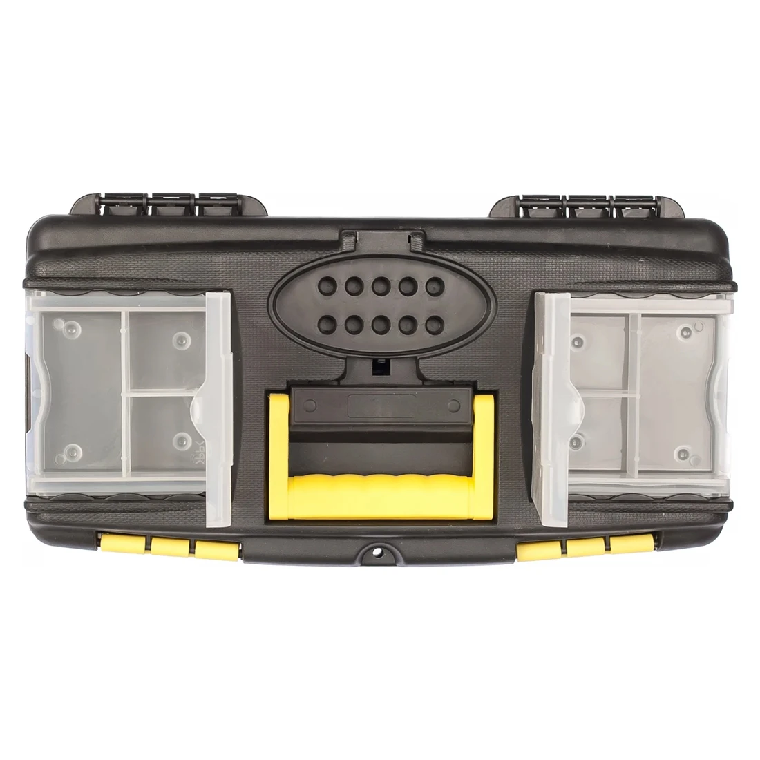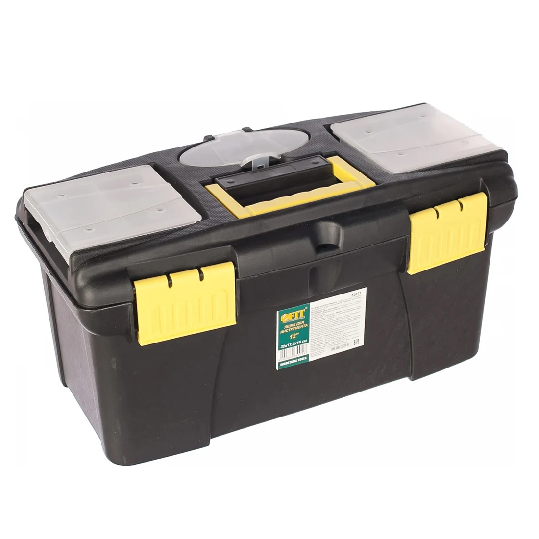 Черно-жёлтая расцветка хорошо заметна среди других коробок и вещей, поэтому ящик проще найти на полке или в багажнике. FIT 65571 — удачный выбор, если нужен ящик для хранения инструмента 12" с подвижным лотком и органайзерами на крышке, чтобы держать инструмент и расходники в порядке и всегда иметь всё необходимое под рукой.