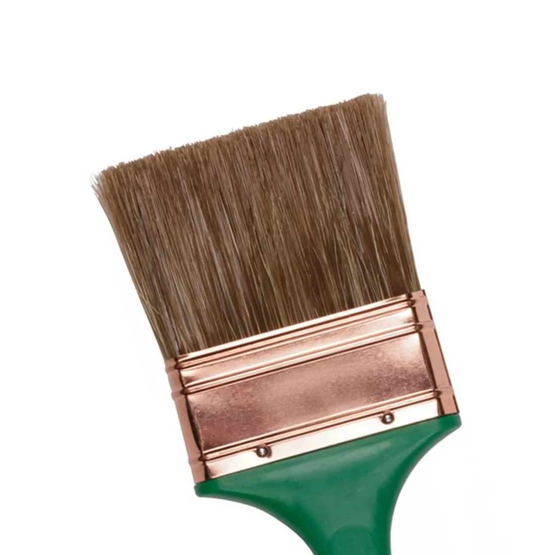 Толщина ворса — 11 мм. Щетина — смешанная: 70 % ПЭТ (синтетика) и 30 % натуральной щетины. Такое сочетание делает кисть пластичной, даёт мягкость нанесения, но сохраняет стойкость к истиранию. Нержавеющий обжим надёжно фиксирует ворс — и дополнительно укреплён заклёпками, чтобы минимизировать выпадение во время активной работы. Рукоять изготовлена из пластика — лёгкая, практичная и удобная в руке.
