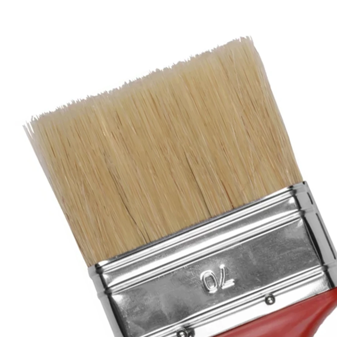 Рабочая часть имеет толщину 12 мм, что обеспечивает хороший захват и удержание краски. Щетина выполнена в смешанном составе: 70 % ПБТ (синтетическое волокно) и 30 % светлая натуральная щетина. Такое сочетание даёт оптимальный баланс упругости и мягкости — кисть легко распределяет краску, не оставляя полос и подтёков. При этом она устойчива к износу и не теряет форму даже при частом использовании.