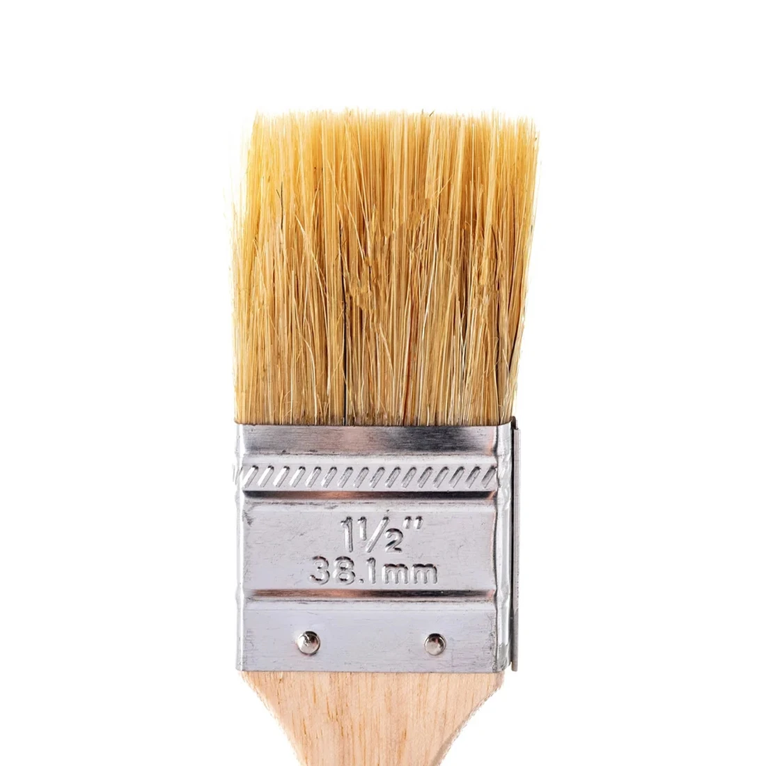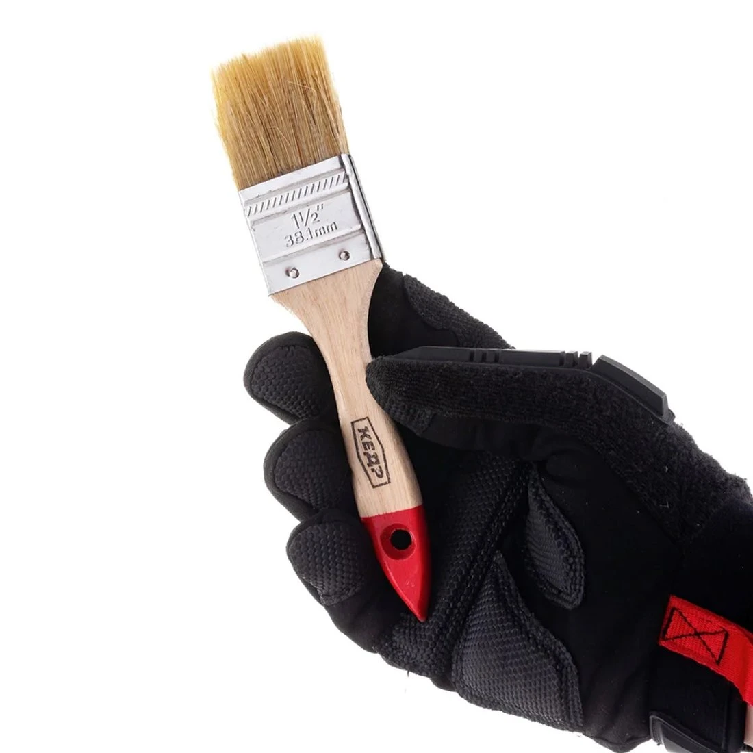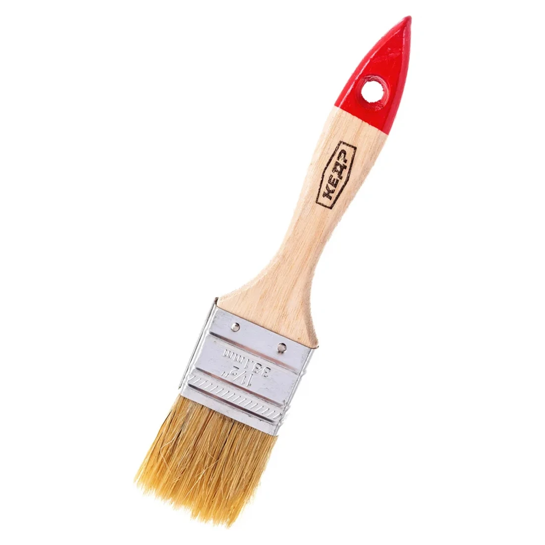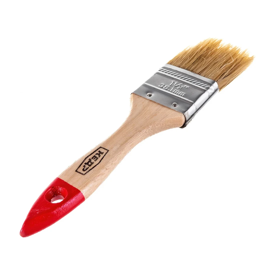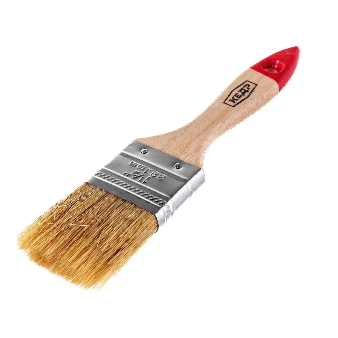 Ширина кисти составляет 38 мм (1,5 дюйма) — оптимальный размер для окраски узких элементов, наличников, откосов, рам и мелких деталей мебели. Металлический бандаж прочно фиксирует ворс, предотвращая его выпадение, а деревянная рукоятка удобна в руке и обеспечивает комфорт при длительной работе. На конце предусмотрено отверстие для подвеса, что упрощает хранение.