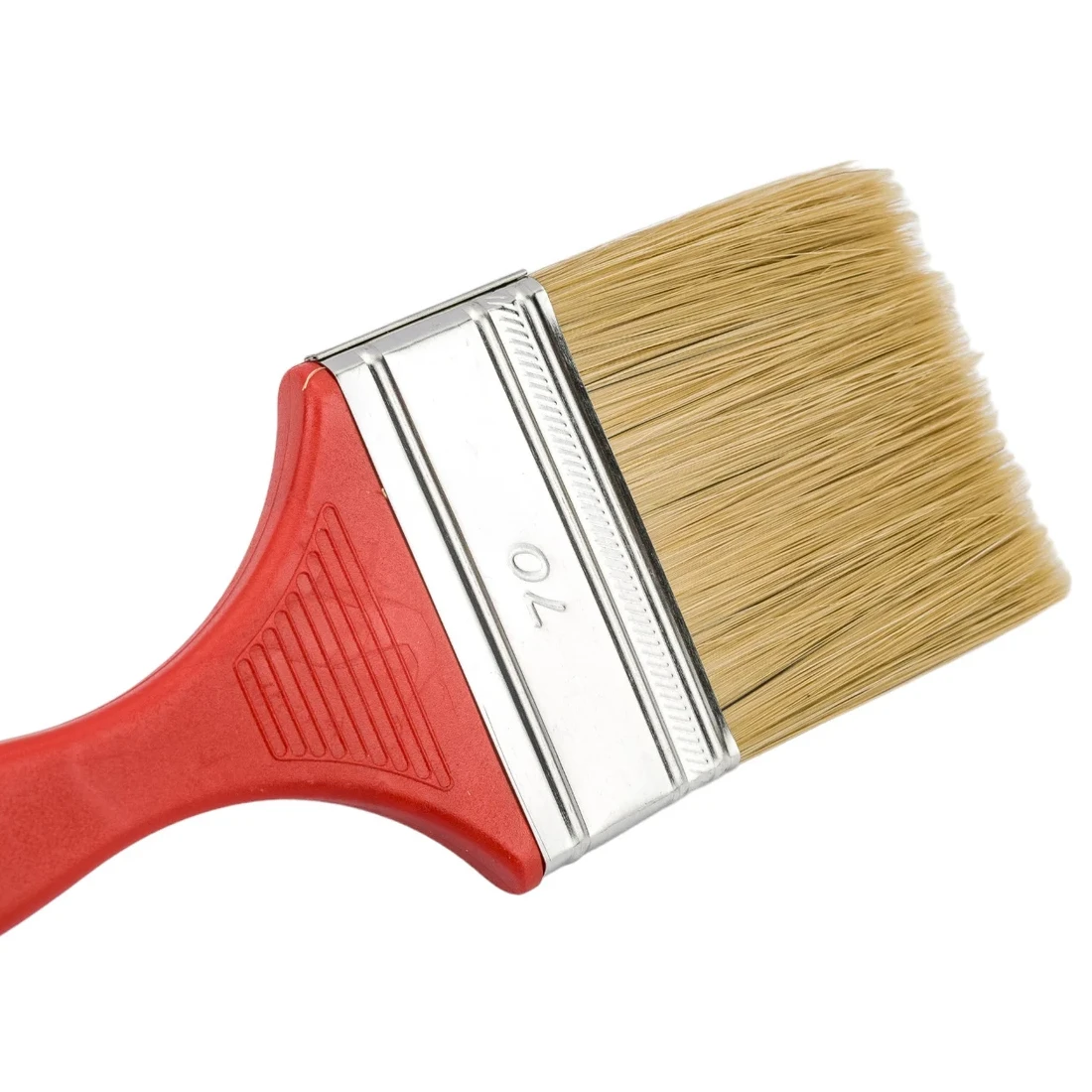 Рабочая часть кисти имеет ширину 70 мм (≈ 2 ¾″), а толщина ворса — 9 мм. Щетина — смешанная: 70 % ПБТ и 30 % натуральной. Такое сочетание позволяет кисти накапливать достаточное количество лака и распределять его равномерно, не оставляя излишков.