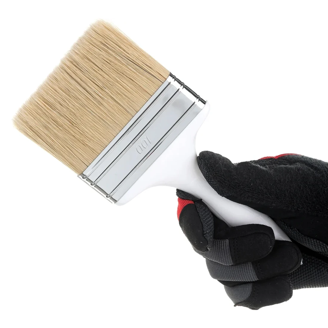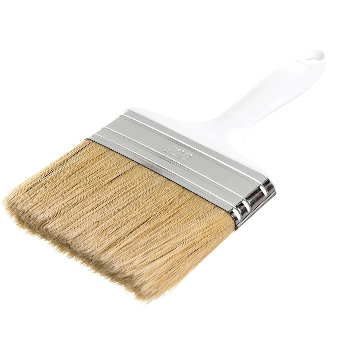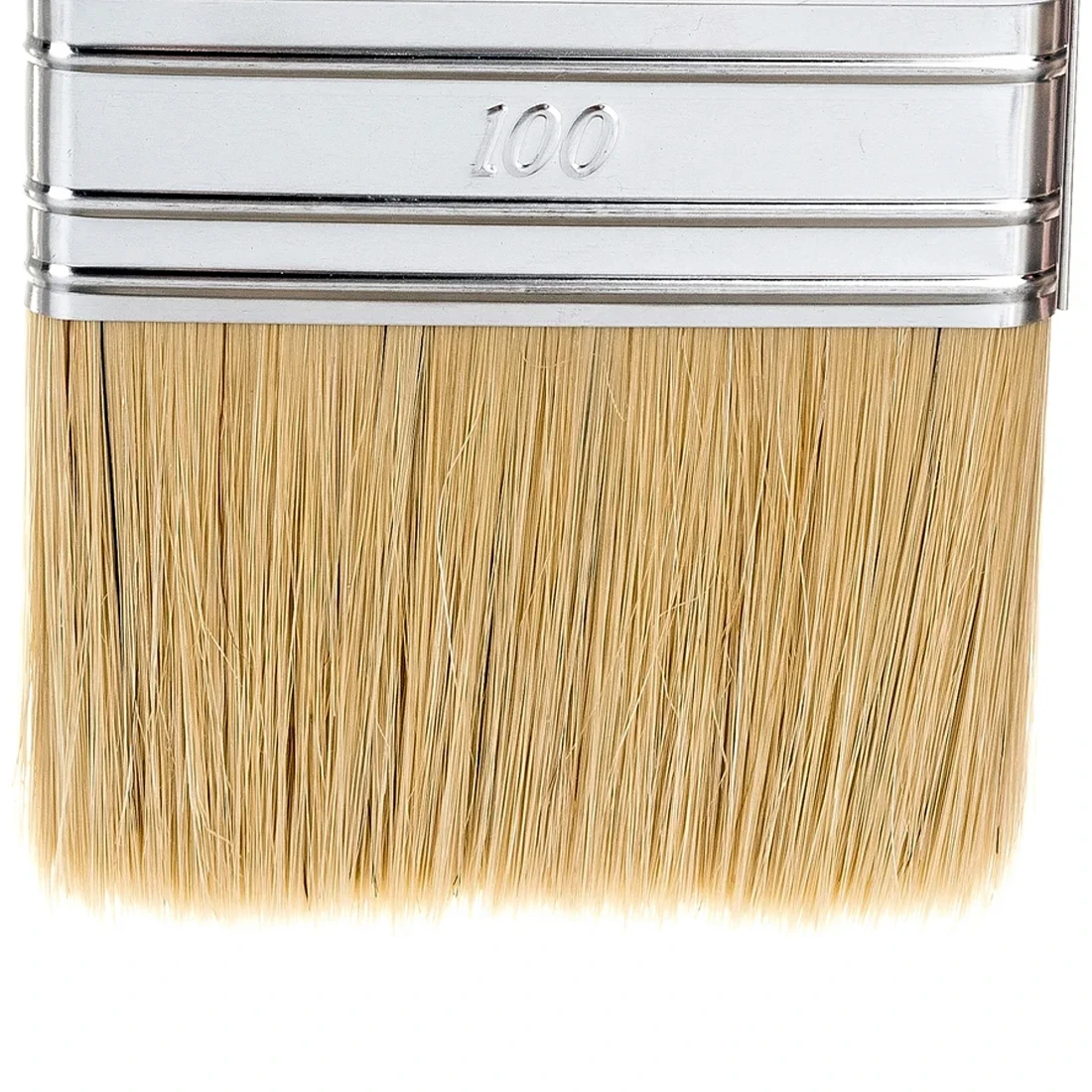 Ширина кисти — 100 мм, толщина — 15 мм. Эта модель справляется с задачами, когда нужно покрыть большие участки, но при этом сохранить контроль над нанесением. Сочетание синтетических и натуральных волокон обеспечивает хорошее удержание краски и её равномерную отдачу, без разводов и подтёков.