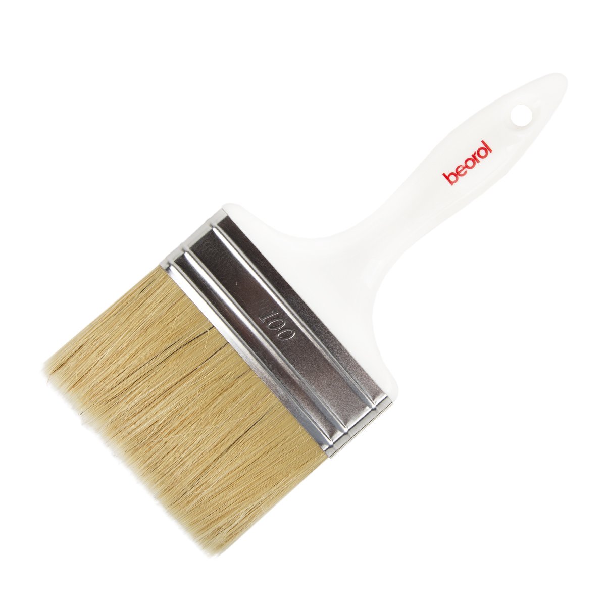 Кисть плоская BEOROL Economy 100×15 мм (модель 40551) — надёжный инструмент для профессиональных малярных работ. Щетина состоит из 70 % ПБТ и 30 % натурального ворса, что позволяет работать как с водоразбавимыми, так и с масляными красками. Обойма из металла прочно фиксирует щетину, пластиковой рукоятке удобно держаться. В ручке есть отверстие для подвешивания.