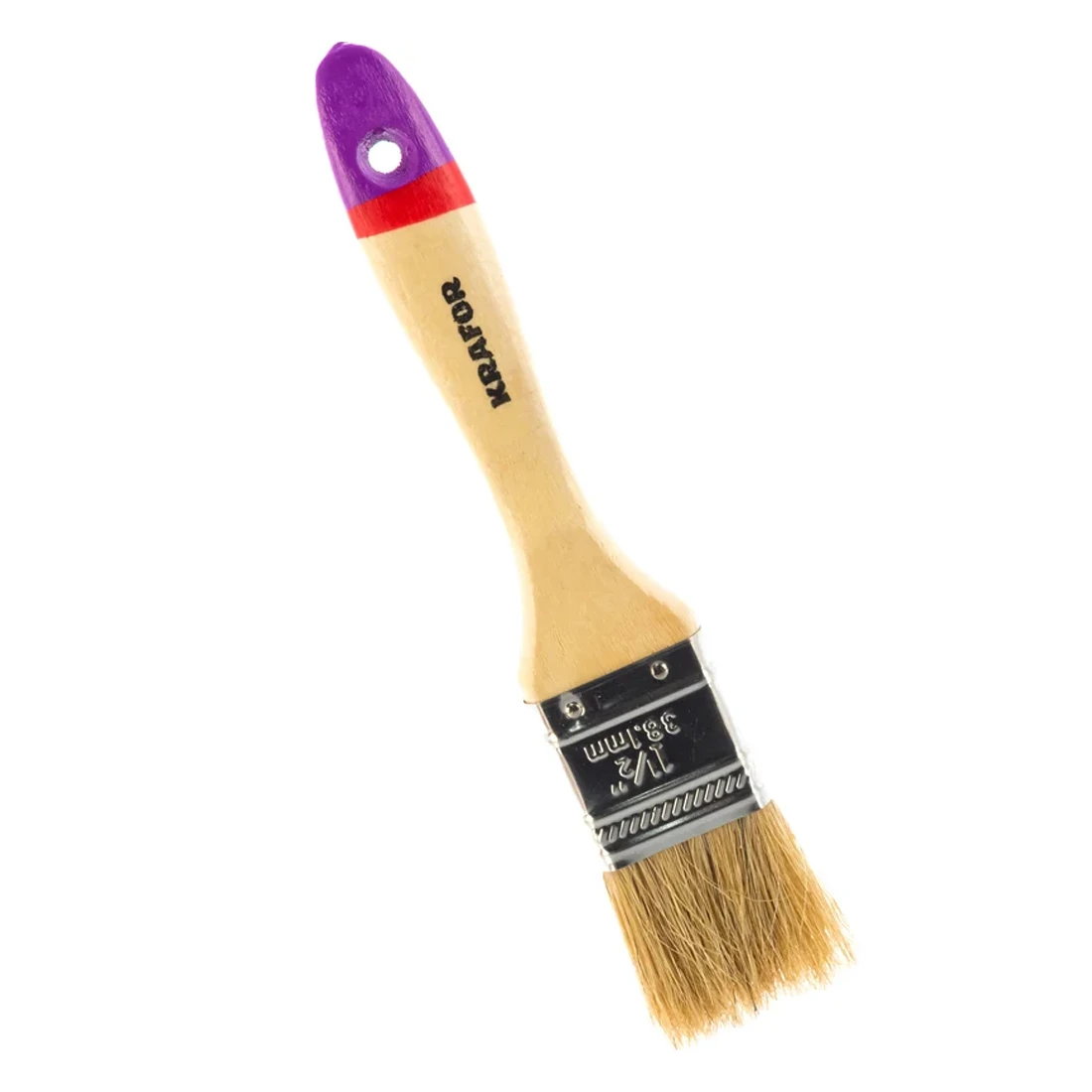 Кисть плоская KRAFOR Евро №1,5 натуральная щетина деревянная ручка 38 мм 49212 — универсальный инструмент для аккуратного окрашивания различных поверхностей. Благодаря рабочей ширине 38 мм кисть идеально подходит для деталей среднего размера: дверных коробок, наличников, мебели и других элементов интерьера.