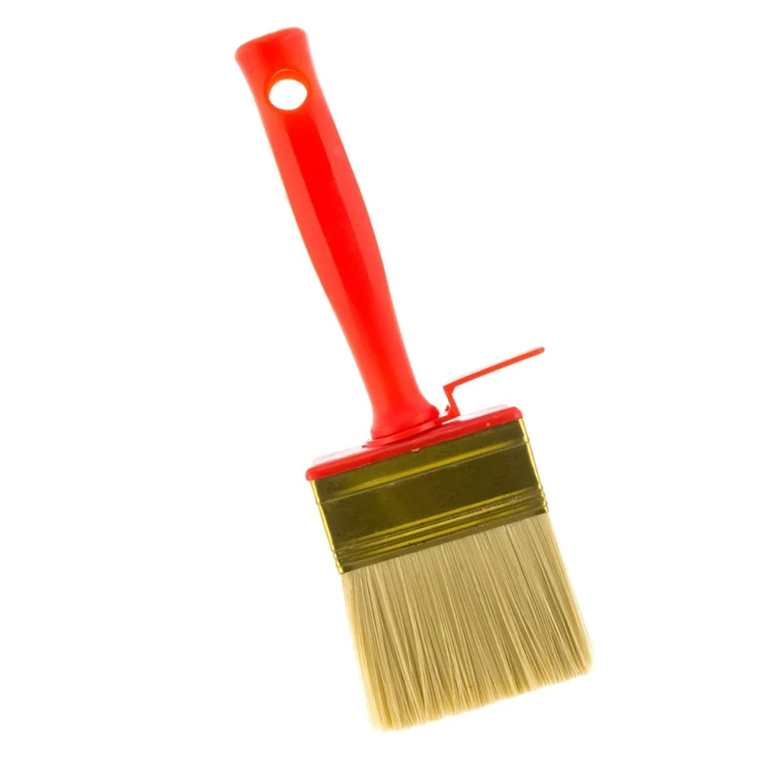 Конструкция плоской кисти предусматривает металлический крюк, позволяющий зафиксировать инструмент на краю ведра — работает “на весу”, не падает в ёмкость с краской.