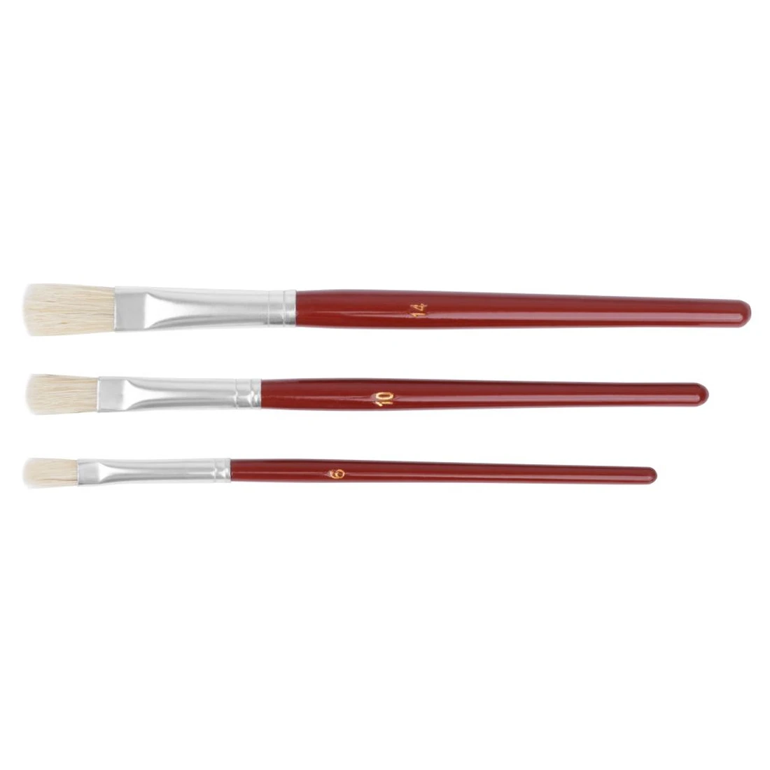В набор входят три плоские кисти разных размеров — №6, №10 и №14. Такой комплект позволяет выполнять как детализированные работы, так и более крупные мазки, что делает его удобным для художественных задач и декоративно-отделочных работ. Кисти подходят для работы со всеми видами лакокрасочных материалов и универсальны в применении.