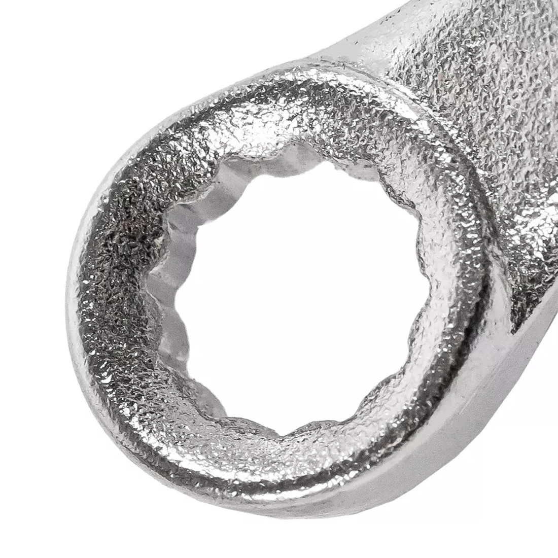 Рожковая часть ключа расположена под углом 15° к оси рукояти, что облегчает доступ к крепежу, расположенному в труднодоступных местах. Такая конструкция позволяет выполнять точные движения, не теряя усилия и не повреждая грани болта. Накидная головка обеспечивает плотный контакт с крепежом, равномерно распределяя нагрузку и исключая срыв грани, что особенно важно при работе с мелким крепежом диаметром 8 мм.