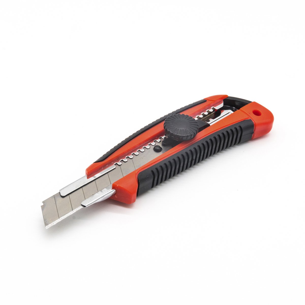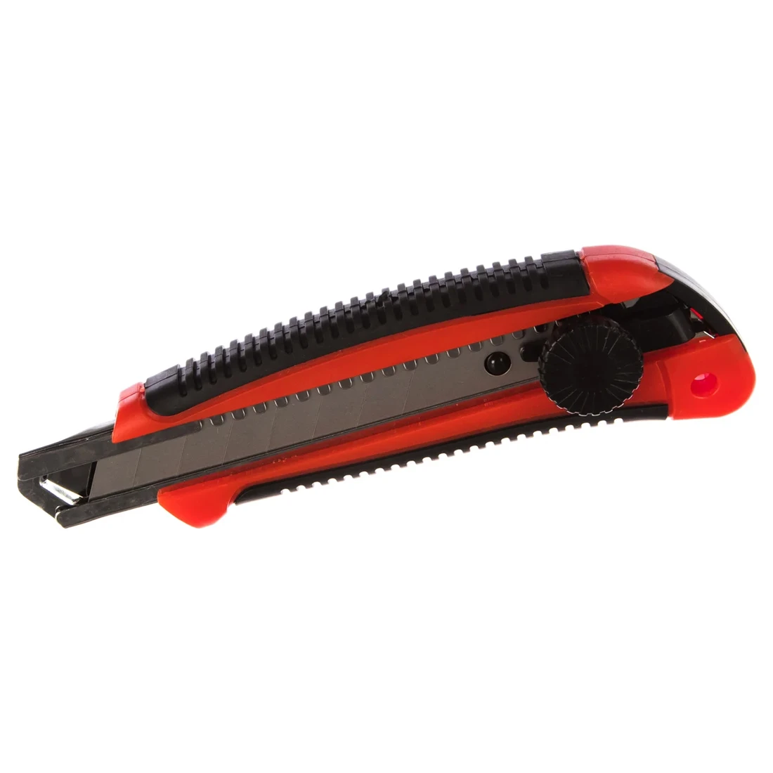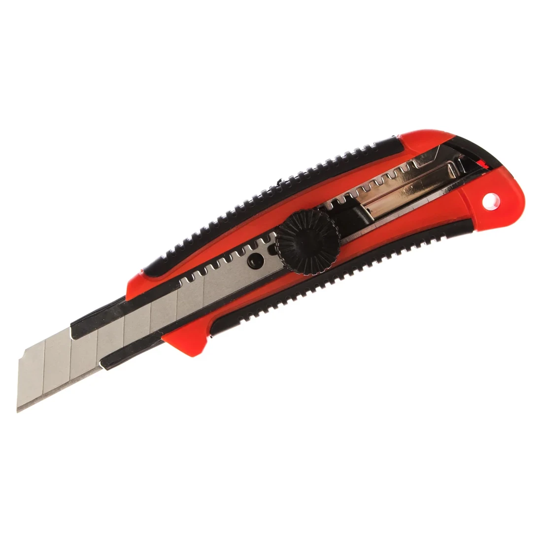 Выдвижное лезвие движется плавно и фиксируется с помощью надёжного винтового механизма, предотвращающего случайное выдвижение или складывание. Отсутствие отделения для запасных лезвий делает конструкцию лёгкой и компактной. Нож легко помещается в карман, сумку или ящик с инструментами, что удобно при работе на объекте. Яркий корпус в красно-чёрной цветовой гамме обеспечивает хорошую видимость инструмента на рабочем месте и предотвращает его случайную потерю.