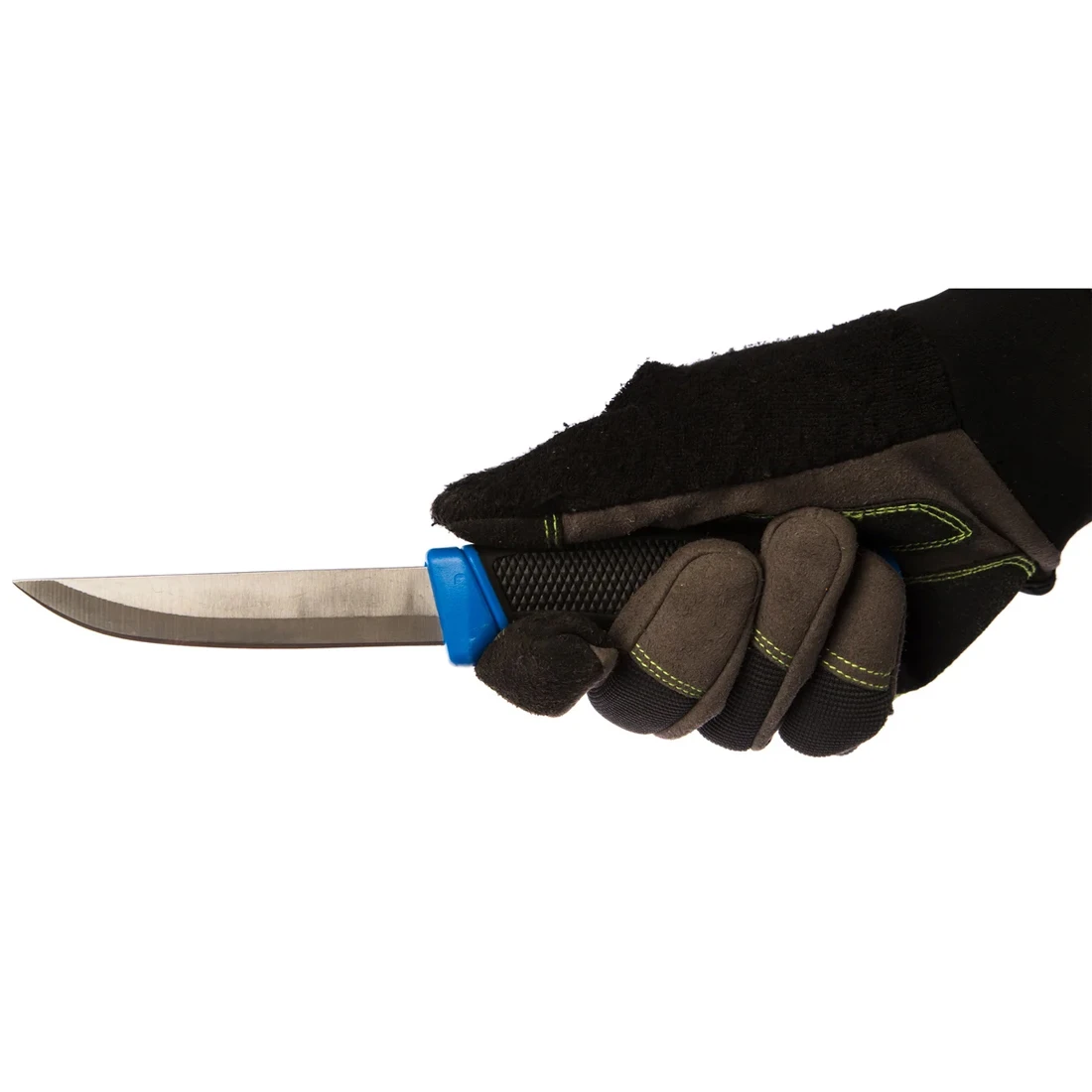 Рукоятка изготовлена из прочного двухкомпонентного пластика с прорезиненными вставками — она не скользит даже при влажных руках, надёжно лежит в ладони и снижает усталость при длительном использовании. Общая длина ножа около 230 мм, что обеспечивает удобный баланс между компактностью и управляемостью. Конструкция с фиксированным лезвием придаёт дополнительную жёсткость и исключает люфт во время работы.