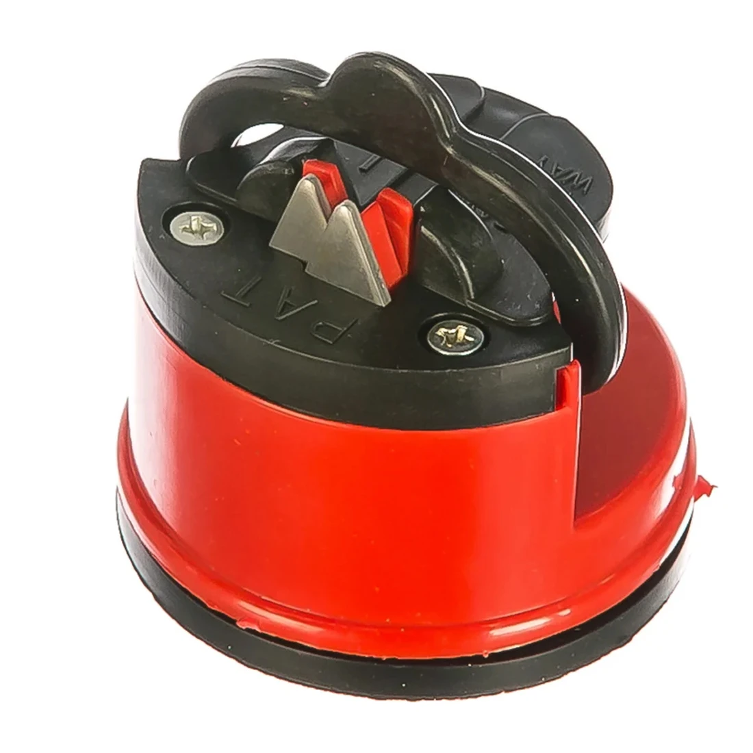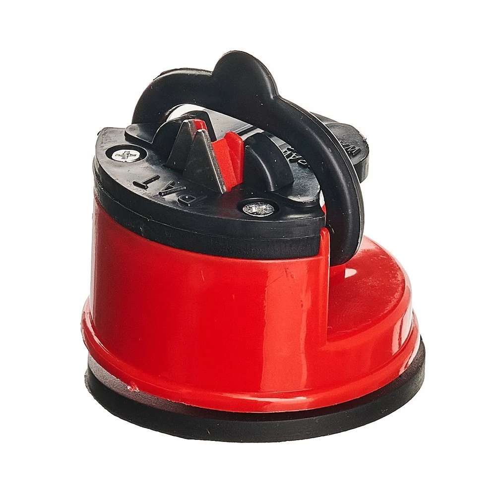 Корпус точилки выполнен из прочного пластика красного цвета. Он лёгкий, но устойчивый к механическим нагрузкам и не боится случайных падений. В основании предусмотрена вакуумная присоска, благодаря которой точилка надёжно фиксируется на гладкой поверхности — столешнице, плитке или верстаке. Это делает процесс заточки безопасным и комфортным: инструмент не скользит и не смещается во время работы.