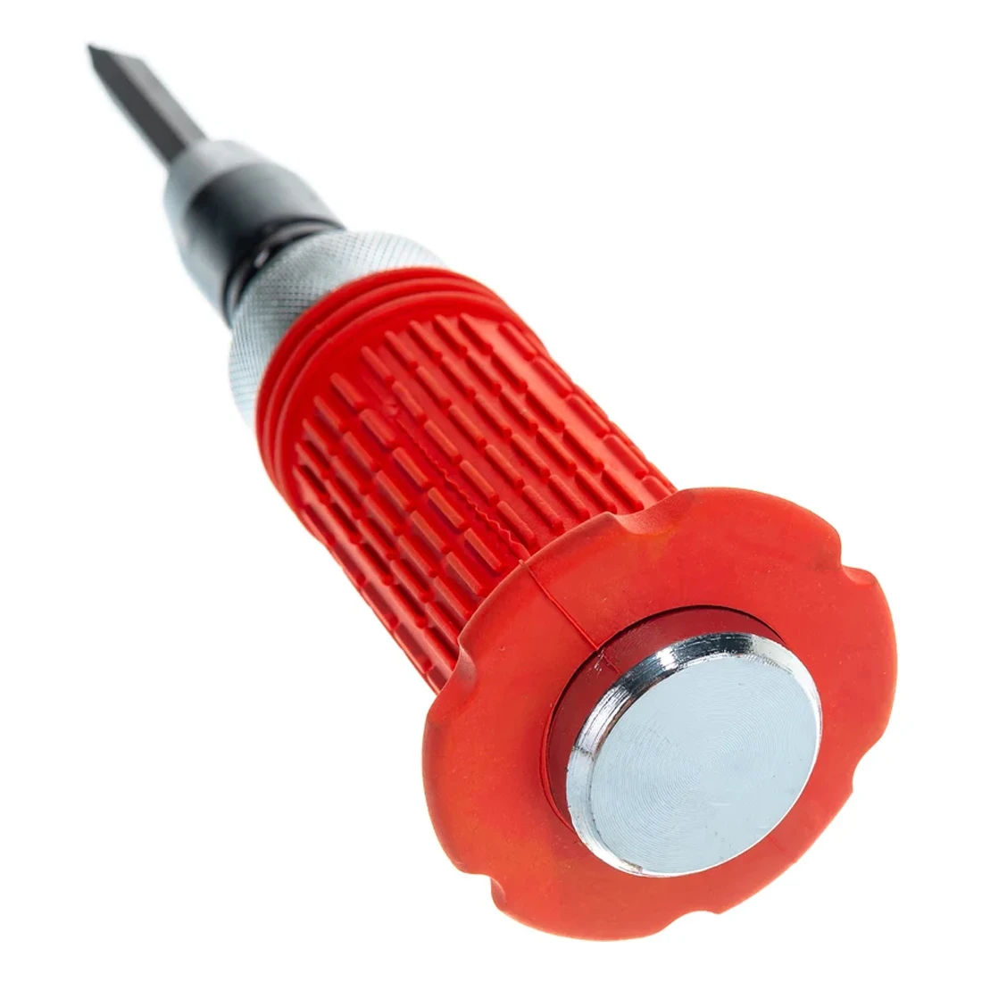 Стержень изготовлен из стали, что обеспечивает надёжность, а рукоятка с резиновым «фартуком» защищает руки и даёт уверенный хват даже при серьёзной нагрузке. В комплект входят шесть бит разных размеров и профилей: две длины бит (36 мм и 75 мм) и типы SL6, SL8, PH2, PH3 — благодаря этому удобно работать с крепежом разного вида.