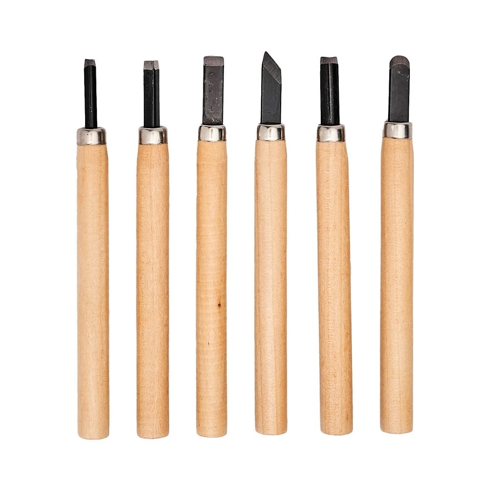 В набор входит 6 различных резцов, которые позволяют выполнять широкий спектр художественных операций: плоская и контурная резьба, выборка углублений, обработка торцов, снятие фасок или прорисовка тонких деталей. Отдельного кейса в комплекте нет, поэтому для хранения можно использовать магнитную планку или индивидуальный чехол — так инструменты всегда будут под рукой и не затупятся.