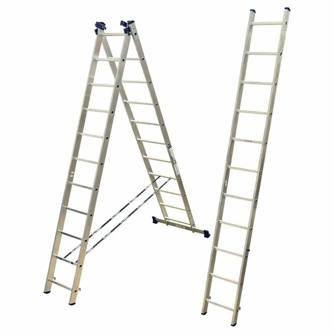 Универсальность данной лестницы заключается в том, что она может использоваться как раздвижная приставная лестница из трех частей и как свободностоящая стремянка (перевернутая русская буква «У»). Более того третья секция является съемной, и ею можно пользоваться отдельно как приставной лестницей, а оставшаяся часть при этом представляет двухсекционную универсальную лестницу. Эта лестница является по праву наиболее универсальной из всех лестниц, и несмотря на необходимый попарный перехлест секций как в конфигурации «приставная лестница» так и в конфигурации «стремянка», что усложняет, утяжеляет и поэтому удорожает ее, является самой популярной по продаваемости из-за своей исключительной универсальности.