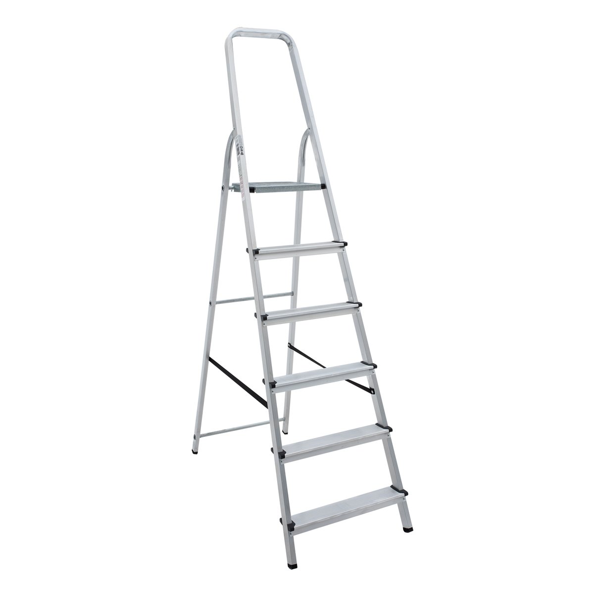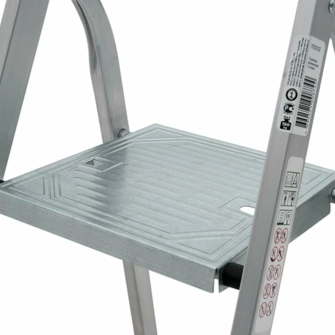 Шесть ступеней имеют рифлёную поверхность, которая обеспечивает уверенное сцепление обуви и снижает риск соскальзывания при подъёме и спуске. Рабочая площадка выполнена из оцинкованной стали и также оснащена рифлением, благодаря чему на высоте удобно стоять и безопасно размещать инструмент или расходные материалы. Продуманная форма площадки повышает комфорт при длительной работе.