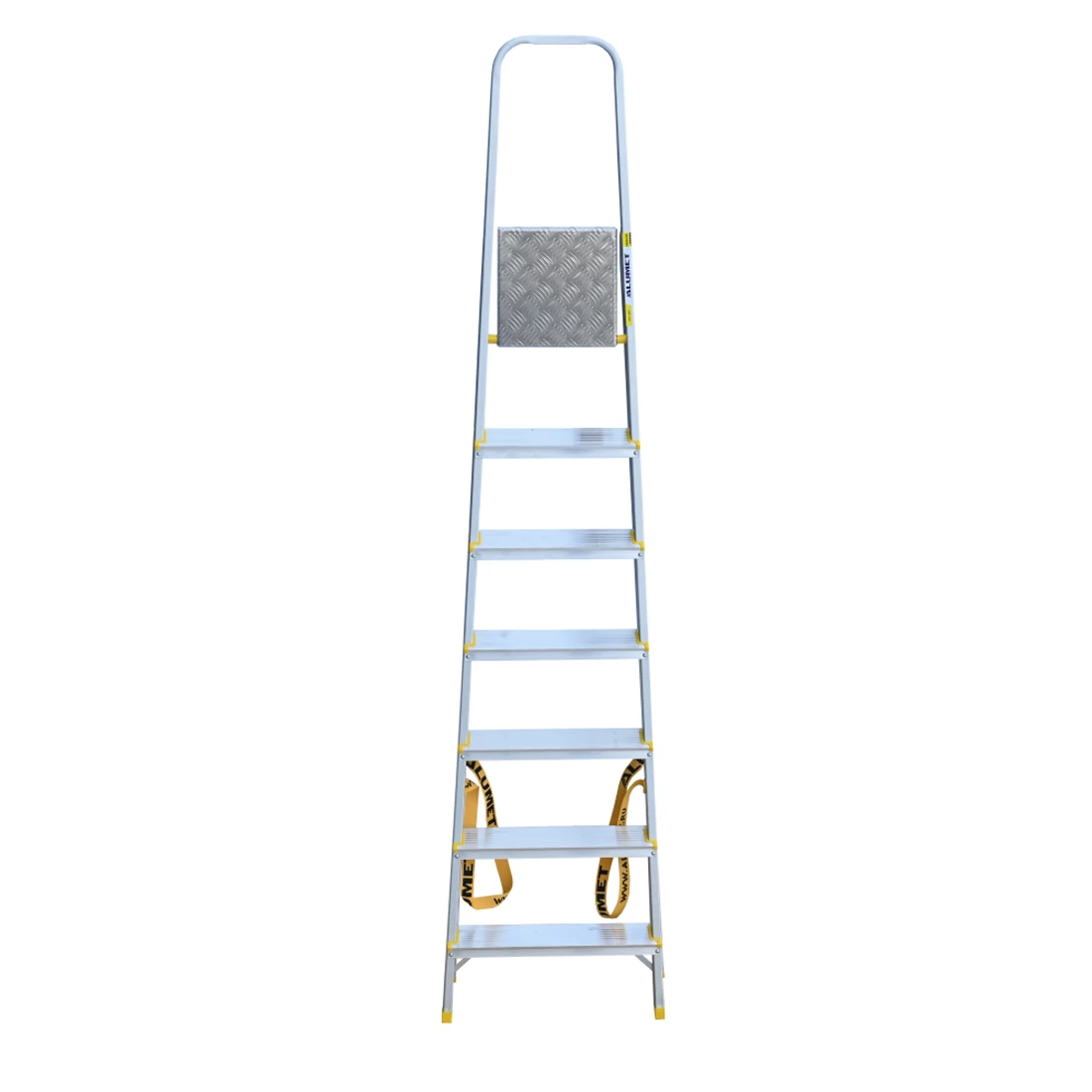 Тетива, площадка и ступени стремянки изготовлены из высокопрочного алюминиевого анодированного профиля. Задняя и передняя нога соединены между собой. Ступени и рабочая площадка имеют рифленую поверхность. Башмаки изготовлены из высокопрочного пластика. Стремянка в рабочем положении надежно фиксируется рабочей площадкой (опорная трубка, на которую ложиться площадка, должна полностью войти в пазы площадки), а с определенного размера дополнительно страховочными ремнями.