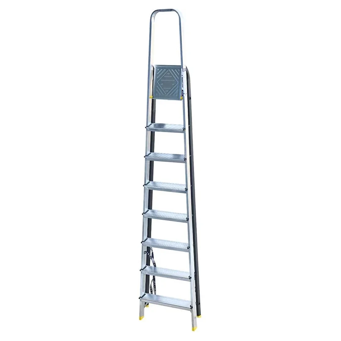 Тетива передней ноги и ступени стремянки изготовлены из высокопрочного алюминиевого профиля, задняя нога – из стального профиля, покрашенного порошковой краской. Задняя и передняя нога соединены между собой. Ступени и рабочая площадка имеют рифленую поверхность. Башмаки изготовлены из высокопрочного пластика. Стремянка в рабочем положении надежно фиксируется рабочей площадкой (опорная трубка, на которую ложиться площадка, должна полностью войти в пазы площадки), а с определенного размера дополнительно страховочными ремнями.
