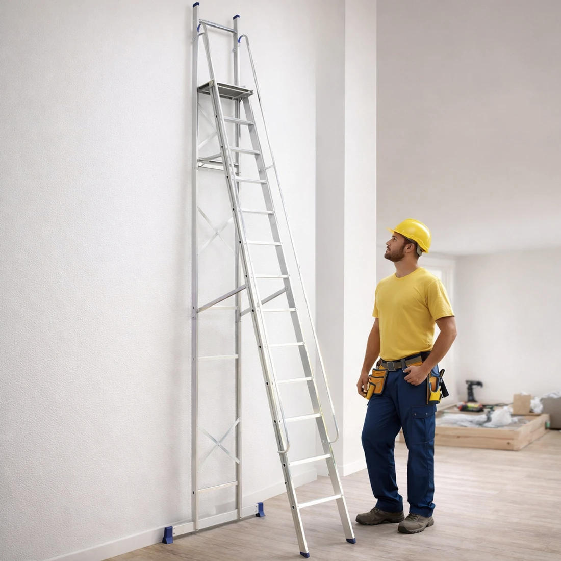 Профессиональная алюминиевая стремянка со стальными поручнями, удобная для применения в складских помещениях. Благодаря высоте и надёжной конструкции, на ней можно без труда работать с большим весом. Дополнительную безопасность обеспечивает высокая дуга безопасности. Для комфортного подъёма и спуска стремянка оснащена специальными поручнями и ремнями безопасности.