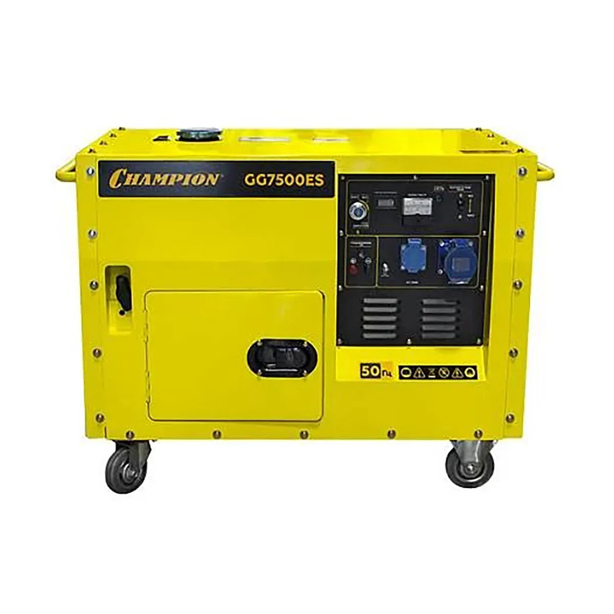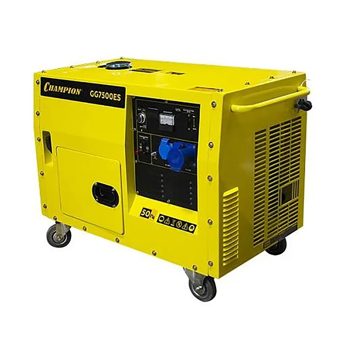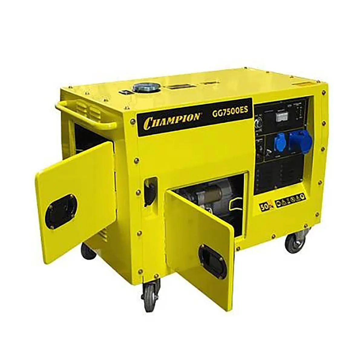 Генератор Champion GG7500ES оснащается силовой розеткой на 32 А, что дает возможность обеспечить питанием устройства повышенной мощности. Металлический кожух отличается шумопоглощающими свойствами, а также служит для защиты рабочих узлов от повреждений при механических воздействиях. Благодаря колесам и ручке эргономичной формы транспортировка модели осуществляется максимально легко. Для удобства доступа к маслозаливной горловине и топливному крану в конструкции оборудования предусматривается наличие дверцы. Пластиковые крышки защищают контакты розеток Champion GG7500ES от попадания влаги и пыли.