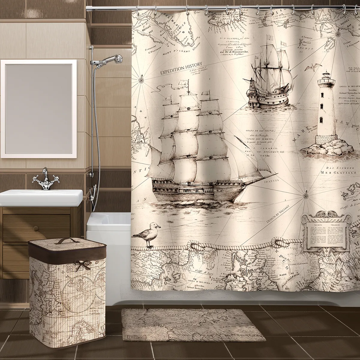 Штора для ванной комнаты Valiant Expedition History, изготовленная из полиэстера, приятна на ощупь, устойчива к разрывам и проколам, не пропускает воду.
