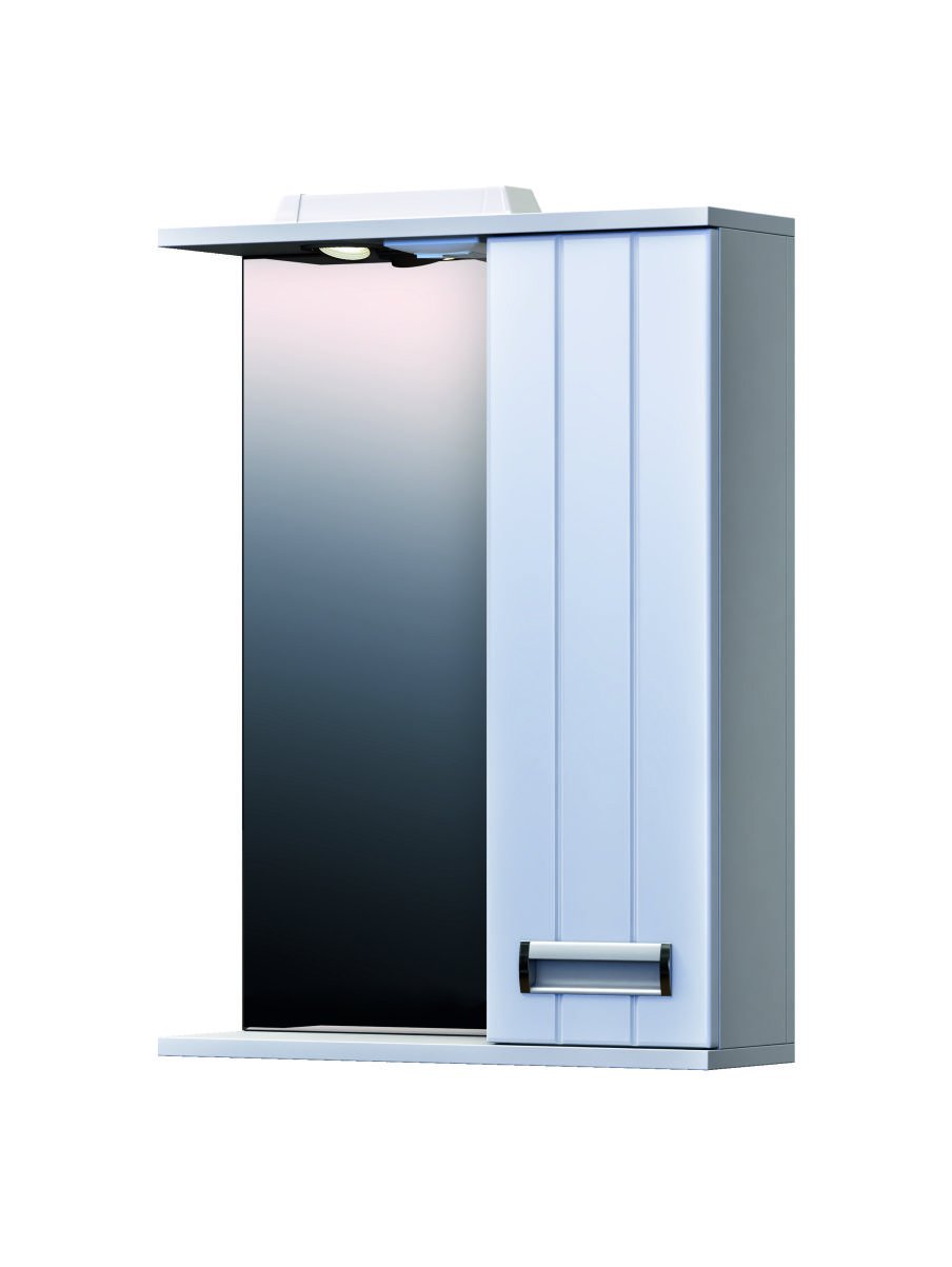 Зеркало с подсветкой и хромированной фурнитурой добавляет шкафу элегантность и позволяет зрительно расширить пространство ванной комнаты.