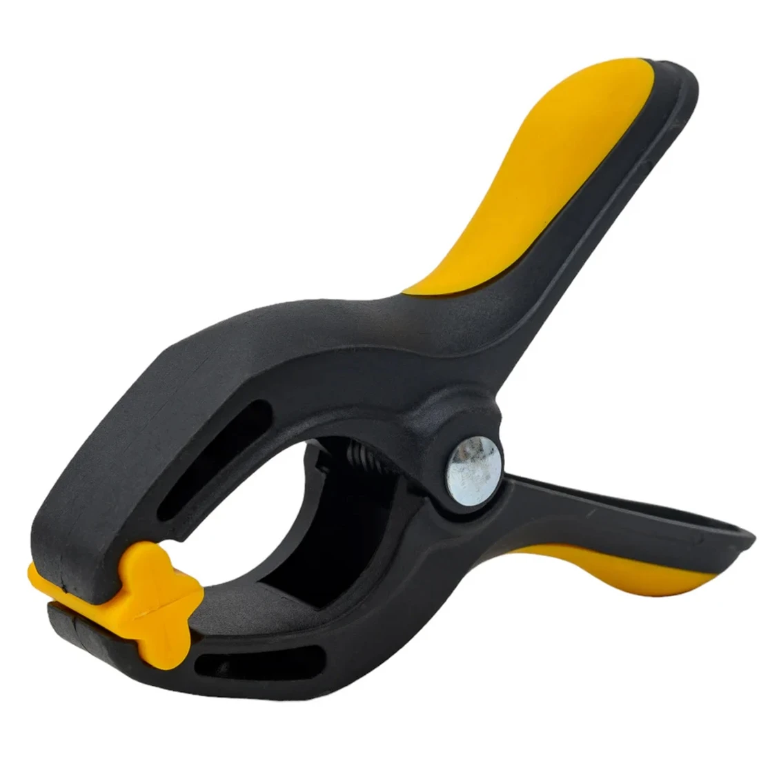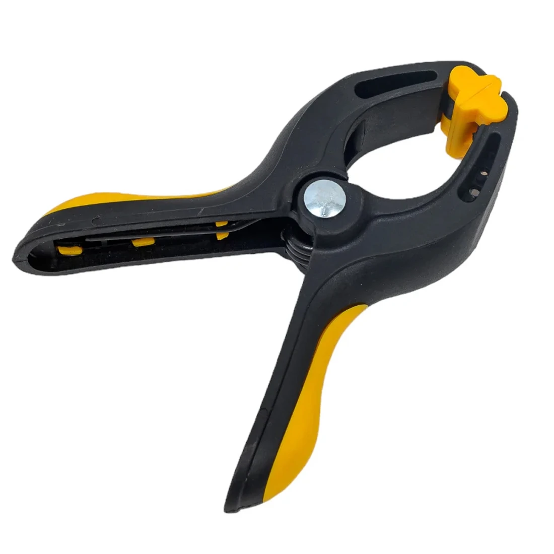 Корпус зажима выполнен из прочного высококачественного пластика, устойчивого к механическим нагрузкам и износу. Материал не подвержен деформации и сохраняет упругость даже при длительном применении. Рабочие губки имеют полукруглую форму и снабжены нейлоновыми накладками с рифлёной поверхностью, что обеспечивает надёжное сцепление с материалом без повреждения поверхности. Такое решение делает зажим безопасным для деликатных или окрашенных деталей.