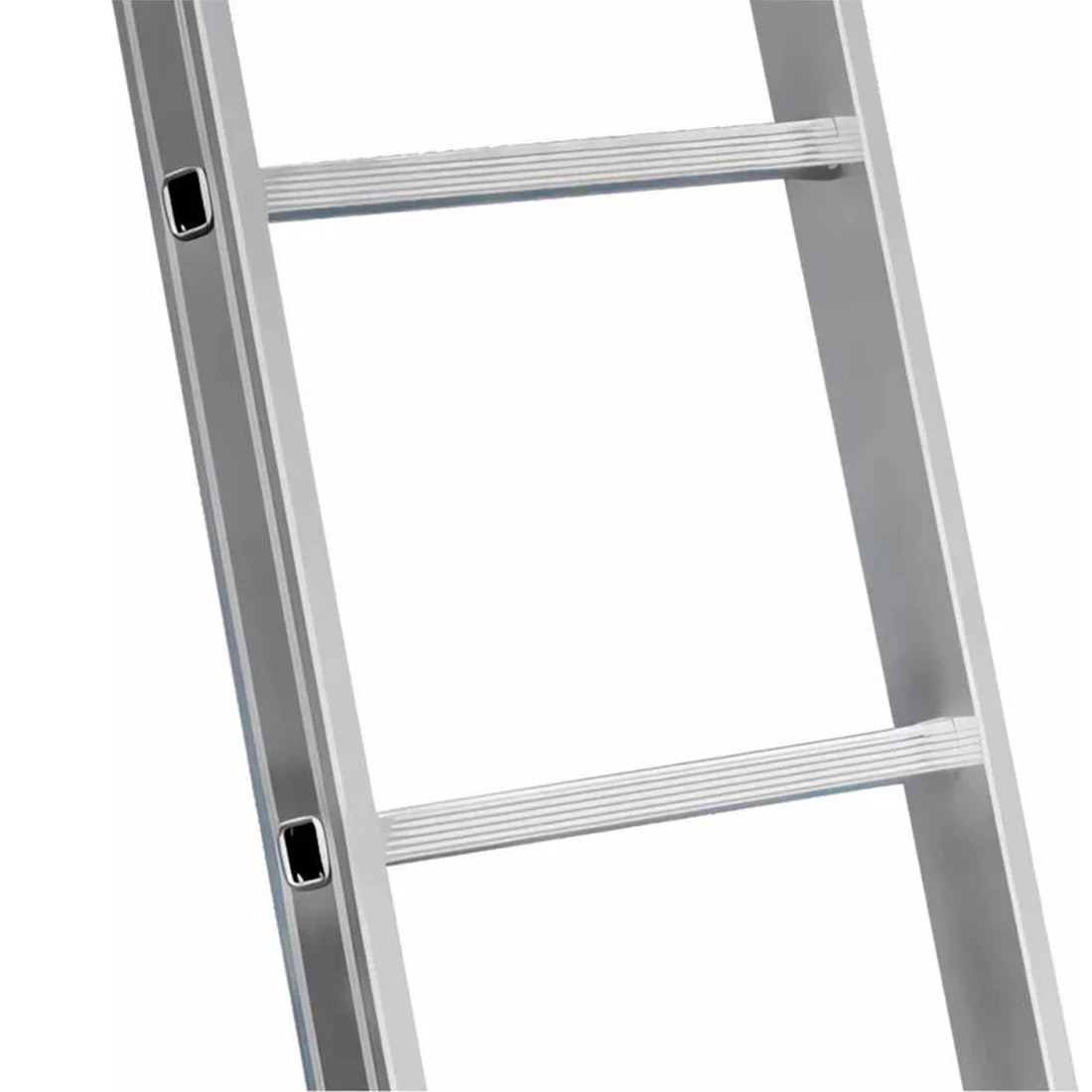 Тетивы и ступени выполнены из алюминиевого профиля, который сочетает небольшой вес и достаточную жёсткость для регулярного использования. Ширина лестницы 320 мм помогает устойчиво выставить её у стены, а ширина ступеней 23 мм даёт нормальную опору для ноги при подъёме. Ступени имеют рифлёную поверхность, поэтому сцепление с обувью лучше и подниматься безопаснее, особенно когда приходится часто спускаться и подниматься во время работы.