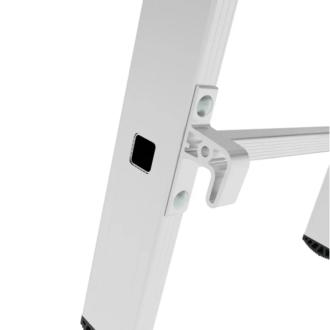 Для предотвращения расхождения секций предусмотрены прочные страховочные ремни. Широкая поперечная траверса повышает устойчивость конструкции, а пластиковые наконечники на стойках и траверсе препятствуют скольжению и защищают поверхность пола. Верхняя секция легко вынимается и может использоваться как отдельная приставная лестница, что удобно при выполнении локальных задач.