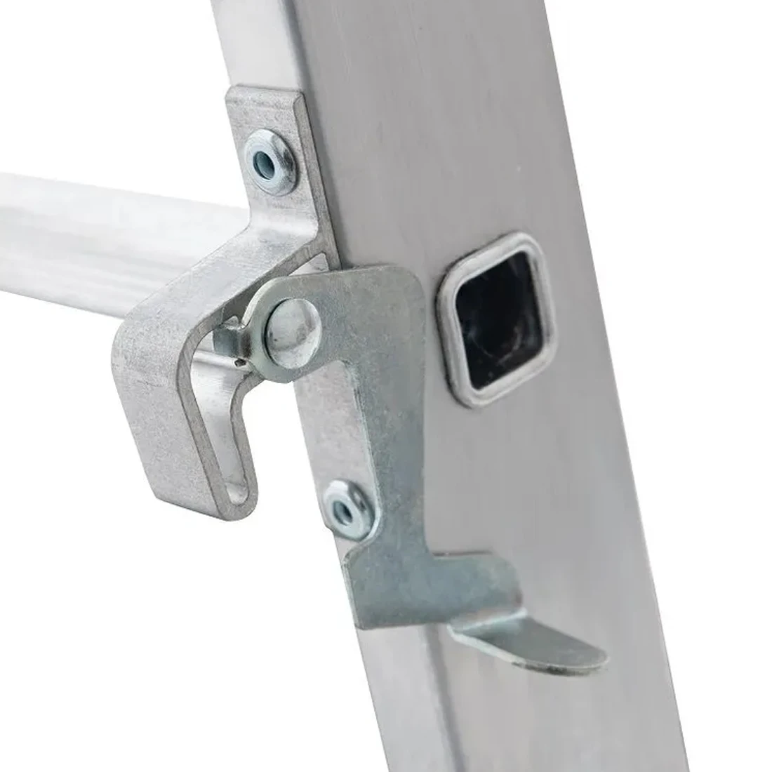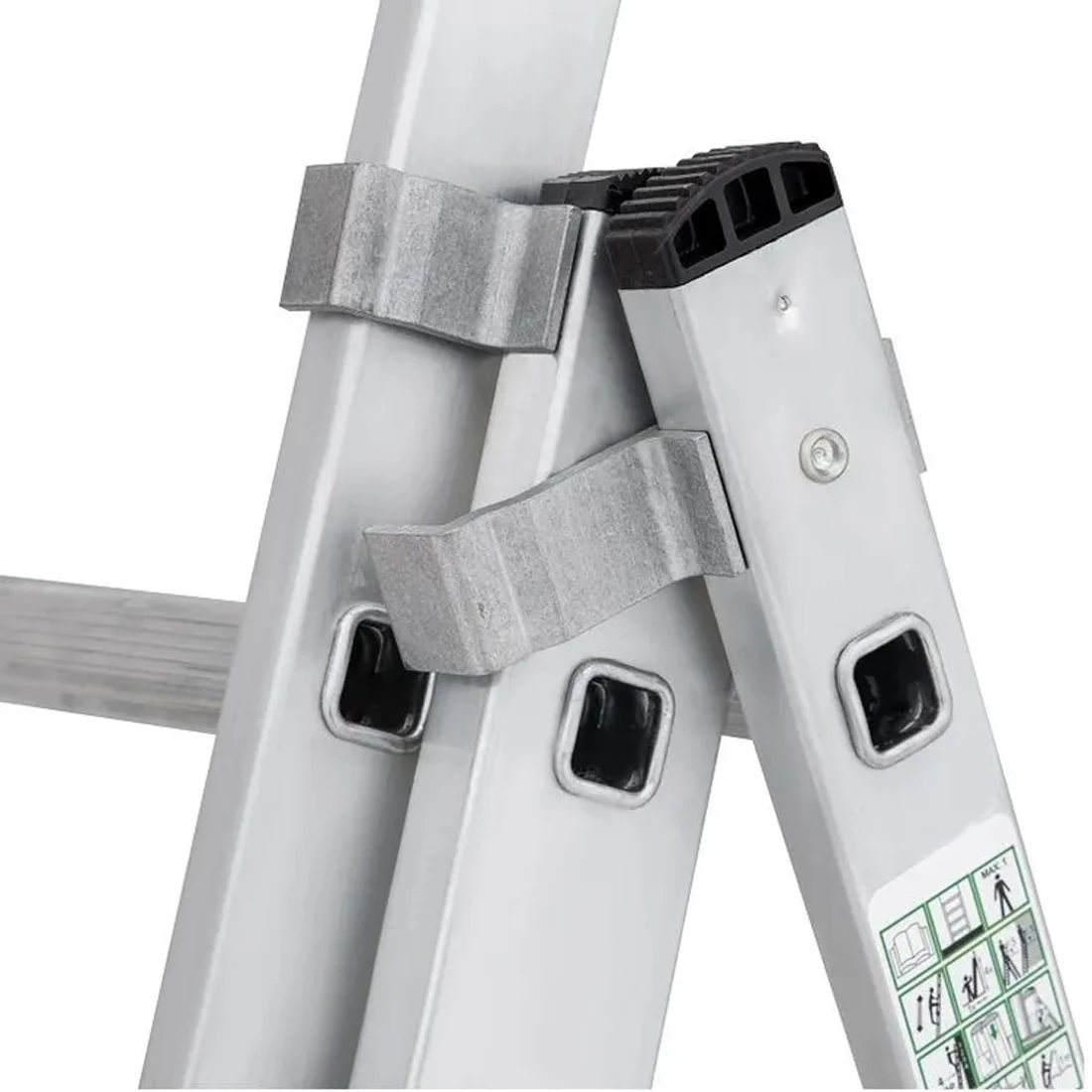 Чтобы алюминиевая раздвижная лестница фиксировалась надёжно, предусмотрены 2 зацепа и автоматический фиксатор секции с установкой на нужном шаге. Кронштейны соединяют и направляют секции, помогая плавно раздвигать лестницу и удерживать геометрию в рабочем положении. Для дополнительной жёсткости используются страховочные ремни на заклёпках с увеличенной шляпкой: они поддерживают правильный угол раскрытия и уменьшают «гуляние» конструкции.
