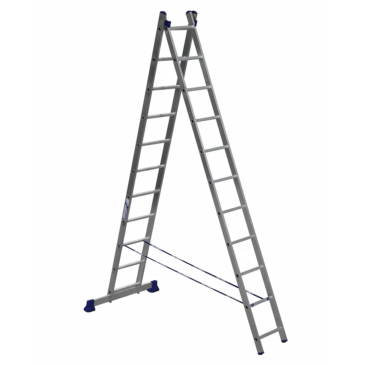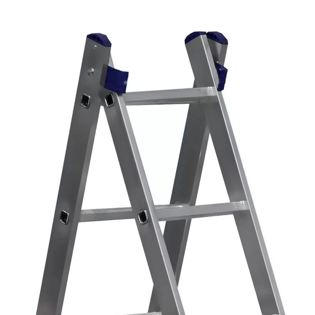 Прочность конструкции в приставном виде обеспечивается необходимым перехлестом секций. От «расползания» лестницу в конфигурации «двухсторонняя стремянка» удерживают страховочные ремни. Они же обеспечивают требуемый перехлест в конфигурации «приставная лестница». Конструкция неразборна, поэтому отдельно пользоваться каждым из двух элементов лестницы невозможно. Толщина стенки придает ощущение комфортности при использовании данных лестниц.