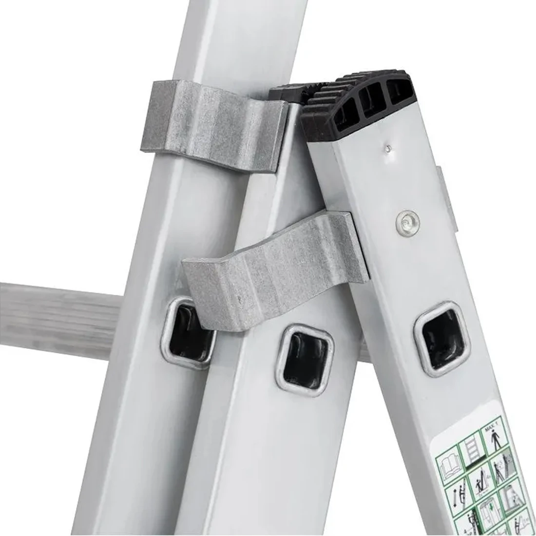 Универсальность данной лестницы заключается в том, что она может использоваться как раздвижная приставная лестница из трех частей и как свободностоящая стремянка (перевернутая русская буква «У»). Более того третья секция является съемной, и ею можно пользоваться отдельно как приставной лестницей, а оставшаяся часть при этом представляет двухсекционную универсальную лестницу. Эта лестница является по праву наиболее универсальной из всех лестниц, и несмотря на необходимый попарный перехлест секций как в конфигурации «приставная лестница» так и в конфигурации «стремянка», что усложняет, утяжеляет и поэтому удорожает ее, является самой популярной по продаваемости из-за своей исключительной универсальности.