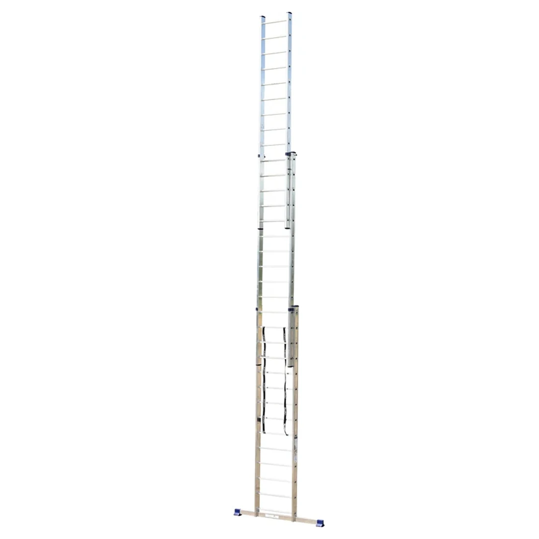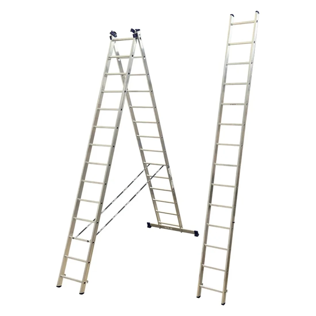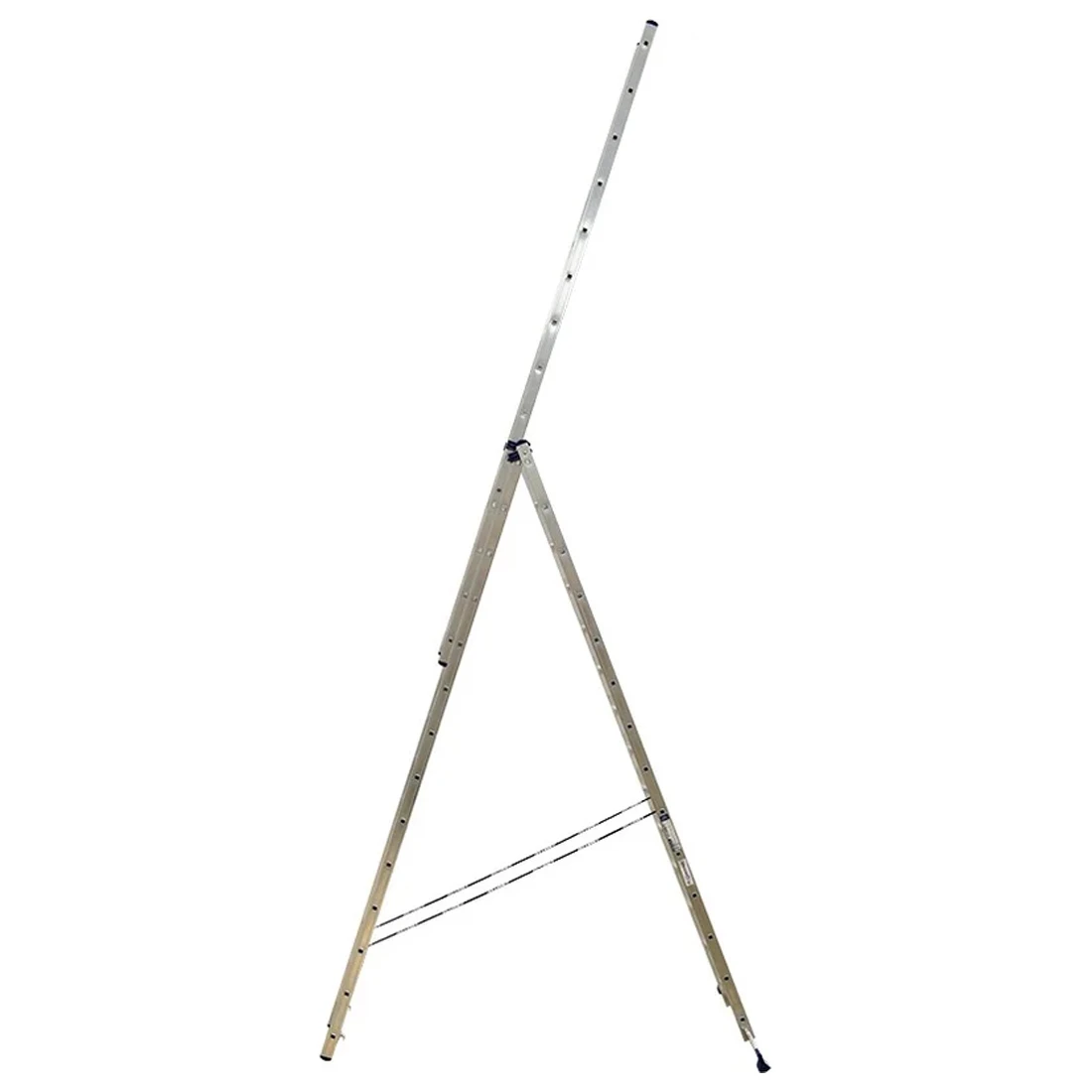 Универсальность данной лестницы заключается в том, что она может использоваться как раздвижная приставная лестница из трех частей и как свободностоящая стремянка (перевернутая русская буква «У»). Более того третья секция является съемной, и ею можно пользоваться отдельно как приставной лестницей, а оставшаяся часть при этом представляет двухсекционную универсальную лестницу. Эта лестница является по праву наиболее универсальной из всех лестниц, и несмотря на необходимый попарный перехлест секций как в конфигурации «приставная лестница» так и в конфигурации «стремянка», что усложняет, утяжеляет и поэтому удорожает ее, является самой популярной по продаваемости из-за своей исключительной универсальности.