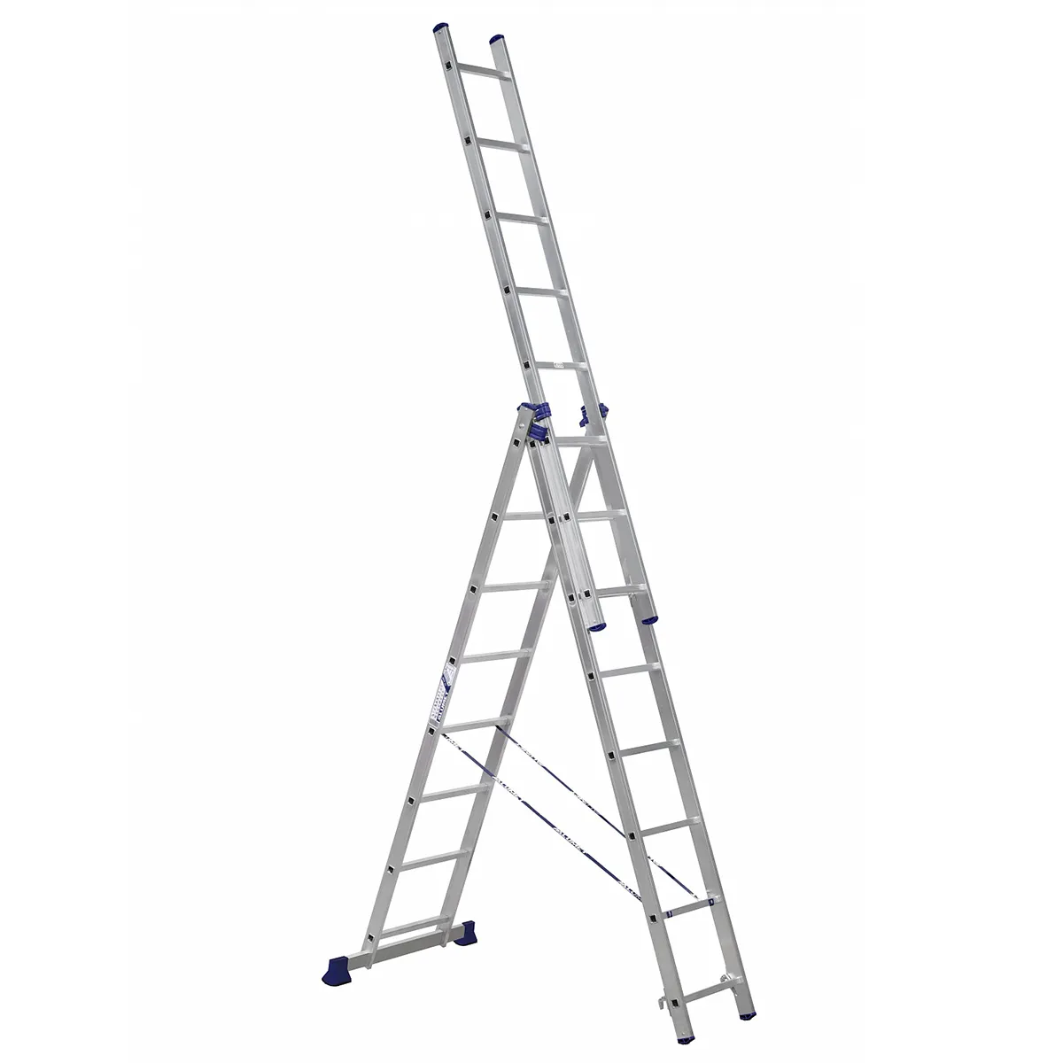 Универсальность данной лестницы заключается в том, что она может использоваться как раздвижная приставная лестница из трех частей и как свободностоящая стремянка (перевернутая русская буква «У»). Более того третья секция является съемной, и ею можно пользоваться отдельно как приставной лестницей, а оставшаяся часть при этом представляет двухсекционную универсальную лестницу. Эта лестница является по праву наиболее универсальной из всех лестниц, и несмотря на необходимый попарный перехлест секций как в конфигурации «приставная лестница» так и в конфигурации «стремянка», что усложняет, утяжеляет и поэтому удорожает ее, является самой популярной по продаваемости из-за своей исключительной универсальности.