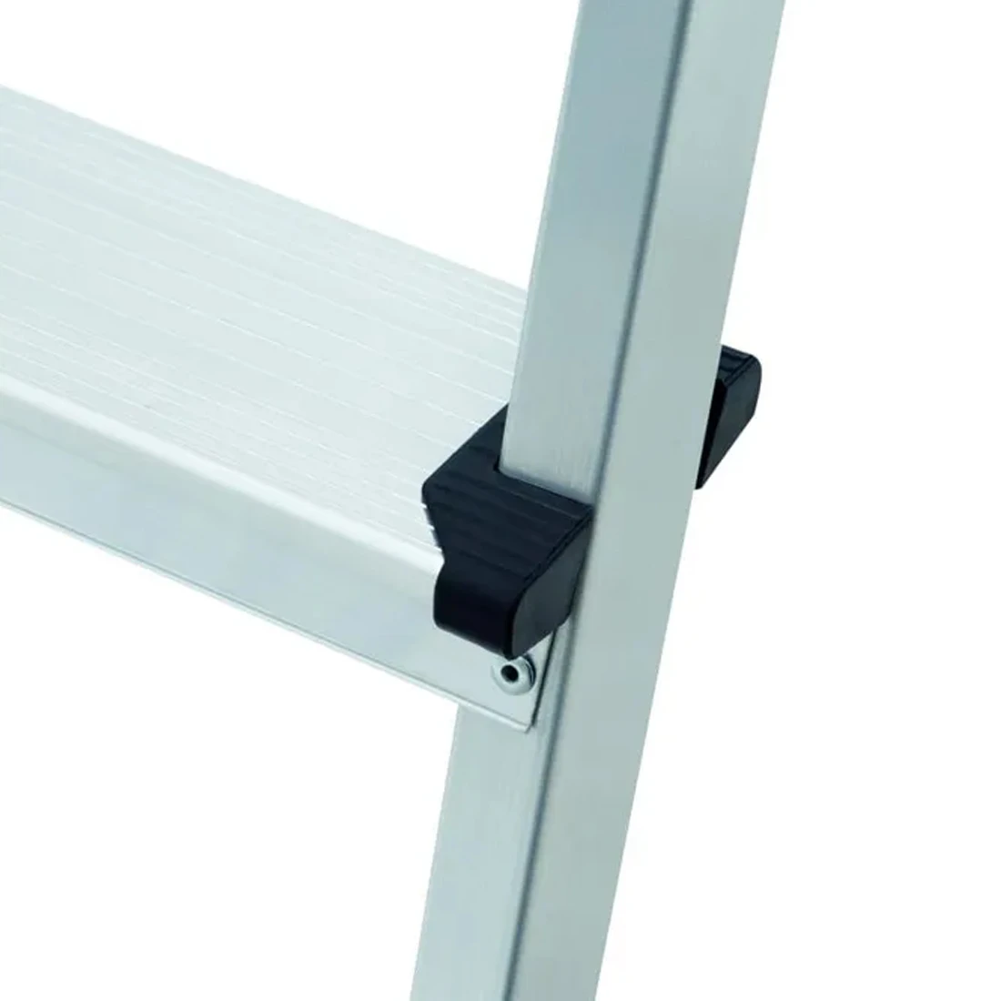 Ступени шириной 80 мм имеют рифлёную поверхность, которая обеспечивает уверенное сцепление обуви и снижает риск соскальзывания. Рабочая площадка также выполнена с противоскользящим рифлением и имеет удобный размер, позволяющий уверенно стоять на высоте и размещать инструмент или расходные материалы под рукой. Такая конструкция делает работу более комфортной и безопасной.