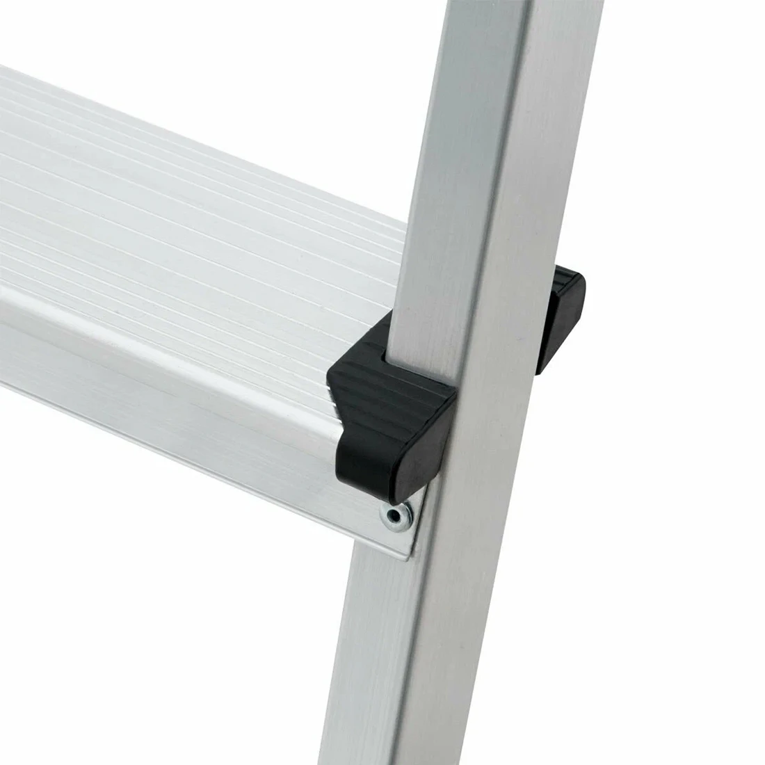Конструкция изготовлена из экструдированных алюминиевых профилей, что обеспечивает высокую прочность при небольшом весе. Алюминий устойчив к коррозии, поэтому стремянку можно использовать как внутри помещений, так и на улице. Прочное крепление ступеней к боковинам выполнено с помощью шести заклёпок на каждую ступень, что повышает жёсткость конструкции и надёжность при нагрузке.