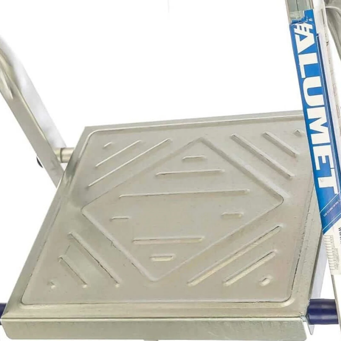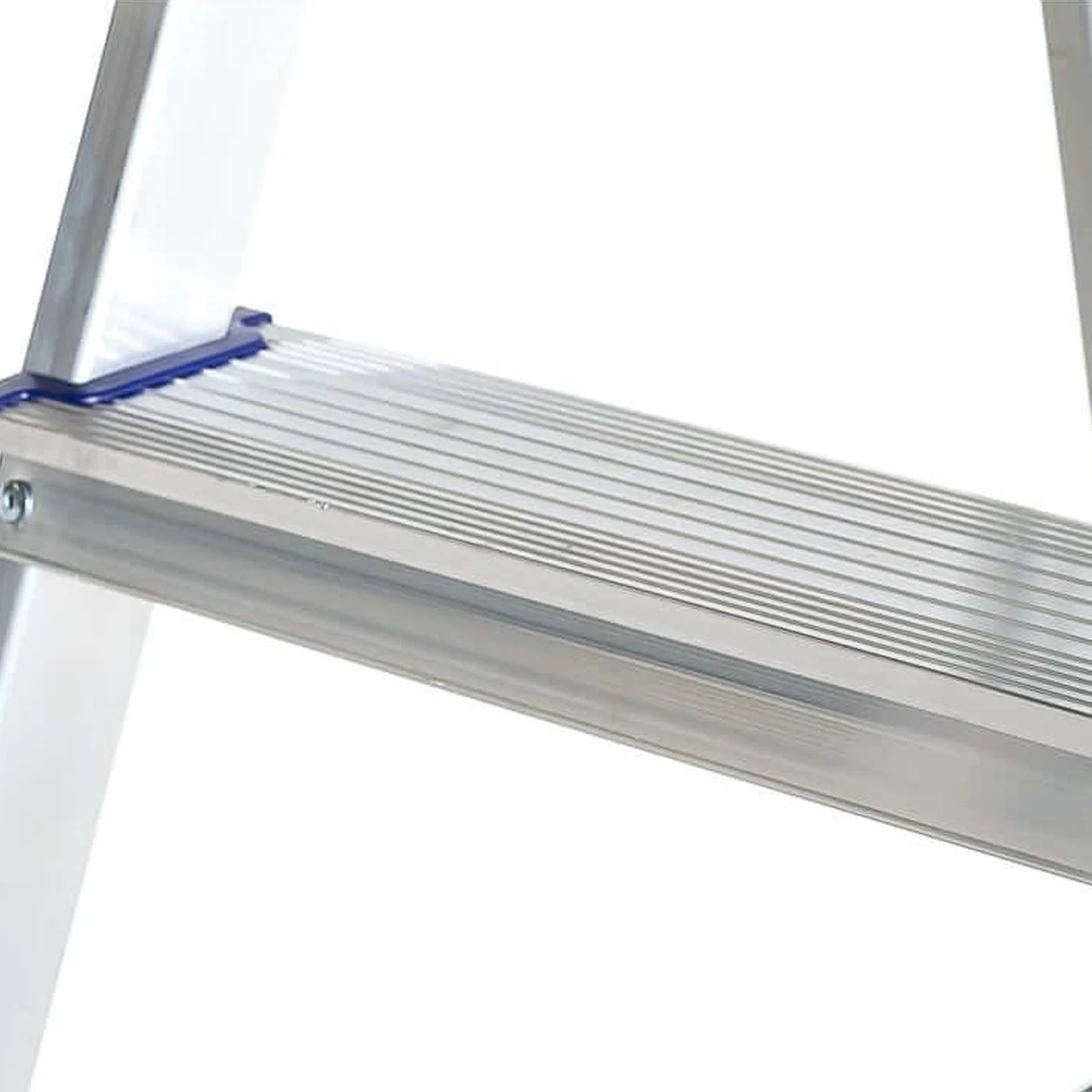 Стремянка изготовлена из высокопрочного алюминиевого профиля. Задняя и передняя нога соединены между собой. Рабочая площадка выполнена из оцинкованной стали. Ступени имеют рифленую поверхность. Башмаки изготовлены из высокопрочного пластика. Стремянка в рабочем положении надежно фиксируется рабочей площадкой
