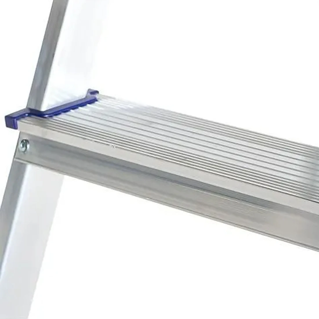Стремянка изготовлена из высокопрочного алюминиевого профиля. Задняя и передняя нога соединены между собой. Рабочая площадка выполнена из оцинкованной стали. Ступени имеют рифленую поверхность. Башмаки изготовлены из высокопрочного пластика. Стремянка в рабочем положении надежно фиксируется рабочей площадкой.