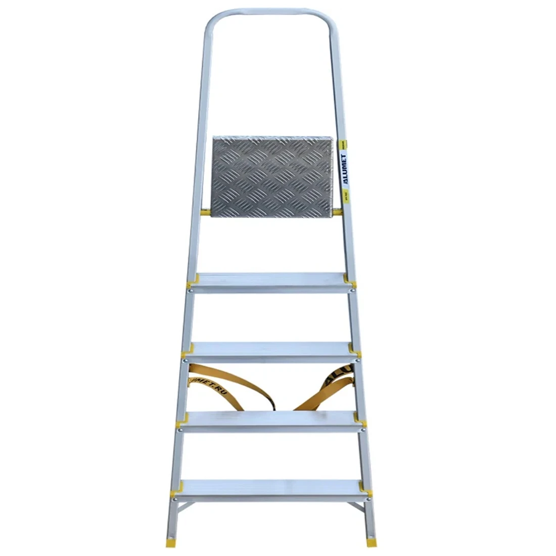 Тетива, площадка и ступени стремянки изготовлены из высокопрочного алюминиевого анодированного профиля. Задняя и передняя нога соединены между собой. Ступени и рабочая площадка имеют рифленую поверхность. Башмаки изготовлены из высокопрочного пластика. Стремянка в рабочем положении надежно фиксируется рабочей площадкой (опорная трубка, на которую ложиться площадка, должна полностью войти в пазы площадки), а с определенного размера дополнительно страховочными ремнями.