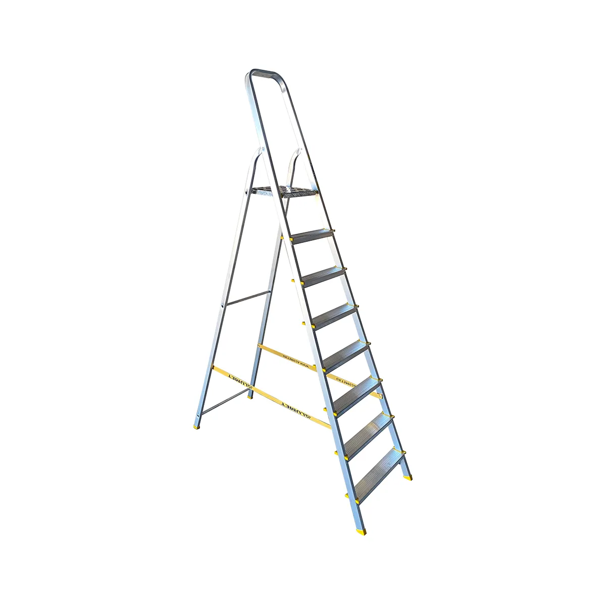 Тетива, площадка и ступени стремянки изготовлены из высокопрочного алюминиевого анодированного профиля. Задняя и передняя нога соединены между собой. Ступени и рабочая площадка имеют рифленую поверхность. Башмаки изготовлены из высокопрочного пластика. Стремянка в рабочем положении надежно фиксируется рабочей площадкой (опорная трубка, на которую ложиться площадка, должна полностью войти в пазы площадки), а с определенного размера дополнительно страховочными ремнями.
