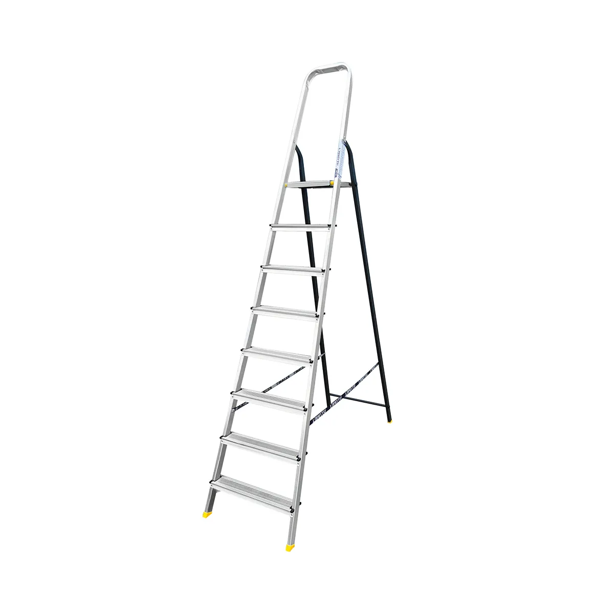 Тетива передней ноги и ступени стремянки изготовлены из высокопрочного алюминиевого профиля, задняя нога – из стального профиля, покрашенного порошковой краской. Задняя и передняя нога соединены между собой. Ступени и рабочая площадка имеют рифленую поверхность. Башмаки изготовлены из высокопрочного пластика. Стремянка в рабочем положении надежно фиксируется рабочей площадкой (опорная трубка, на которую ложиться площадка, должна полностью войти в пазы площадки), а с определенного размера дополнительно страховочными ремнями.